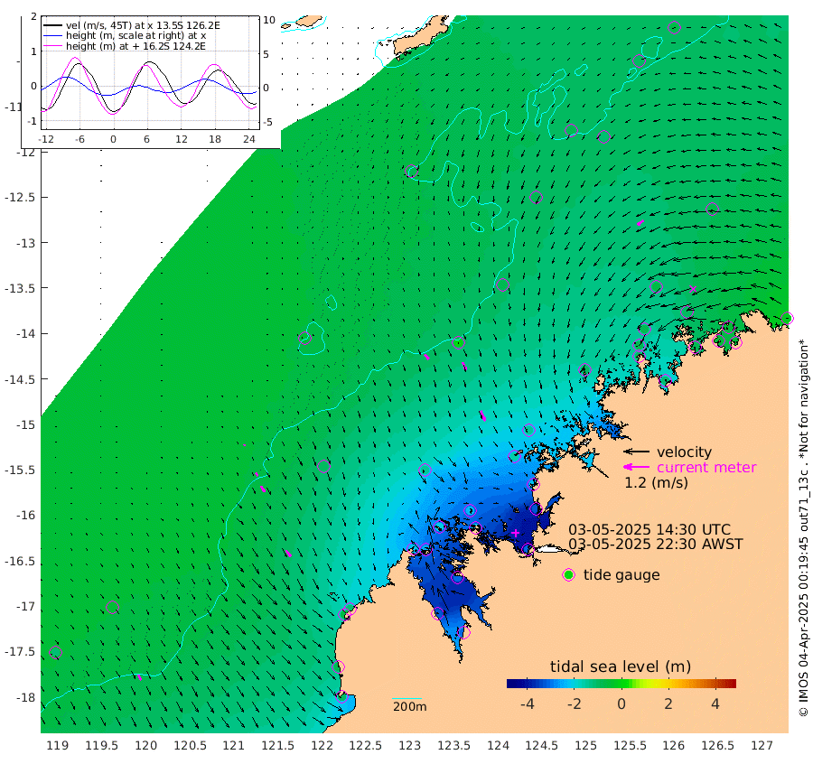 29cm/s 138T +10cm/s rms + 1cm/s 1T. NWSBRW 205m 29cm/s 150T +11cm/s rms + 6cm/s -110T. NWSROW 199m 51cm/s 157T +5cm/s rms + 2cm/s 65T. CAM050 58m 39cm/s 159T +12cm/s rms + 5cm/s 92T. CAM100 99m 7cm/s 158T +7cm/s rms + 1cm/s -85T. KIM400 396m 16cm/s 141T +9cm/s rms + 5cm/s -119T. KIM200 208m 33cm/s 148T +11cm/s rms + 5cm/s -147T. KIM100 99m 36cm/s 141T +8cm/s rms + 3cm/s -103T. KIM050 59m 36cm/s -126T +4cm/s rms + 2cm/s 23T. TIMORS88 91m -119cm Imperieuse Reef -51cm Mermaid Reef -104cm Broome -74cm Cape Baskerville -109cm Red Bluff -80cm Cape Boileau -54cm Scott Reef (WA) -82cm Ashmore Reef -222cm Karrakatta Bay -243cm Sunday Island -317cm Valentine Island -314cm Derby -308cm Port Usborne -206cm Bedford Islands -224cm Yampi Sound (Koolan Island) -234cm Macleay Island -137cm Adele Island 6cm Browse Island -301cm Shale Island -316cm Lizard Island -218cm Hall Point -163cm Degerando Island -135cm White Island -81cm Skua No. 4 Well -109cm Jabiru -99cm Maret Island -89cm Baudin Island -90cm Cape Voltaire (Krait Bay) -91cm Dillon Shoal -63cm Laminaria -108cm Port Warrender -90cm Troughton Island -83cm Cassini Island -74cm West Holothuria Reef Offshore -79cm Jar Island -93cm Lynher Bank -83cm Heywood Shoal -90cm Pee Shoal -73cm Van Cloon Shoal -46cm Carronade Island -49cm Guy Point -52cm Napier Broome Bay -26cm Lesueur Island