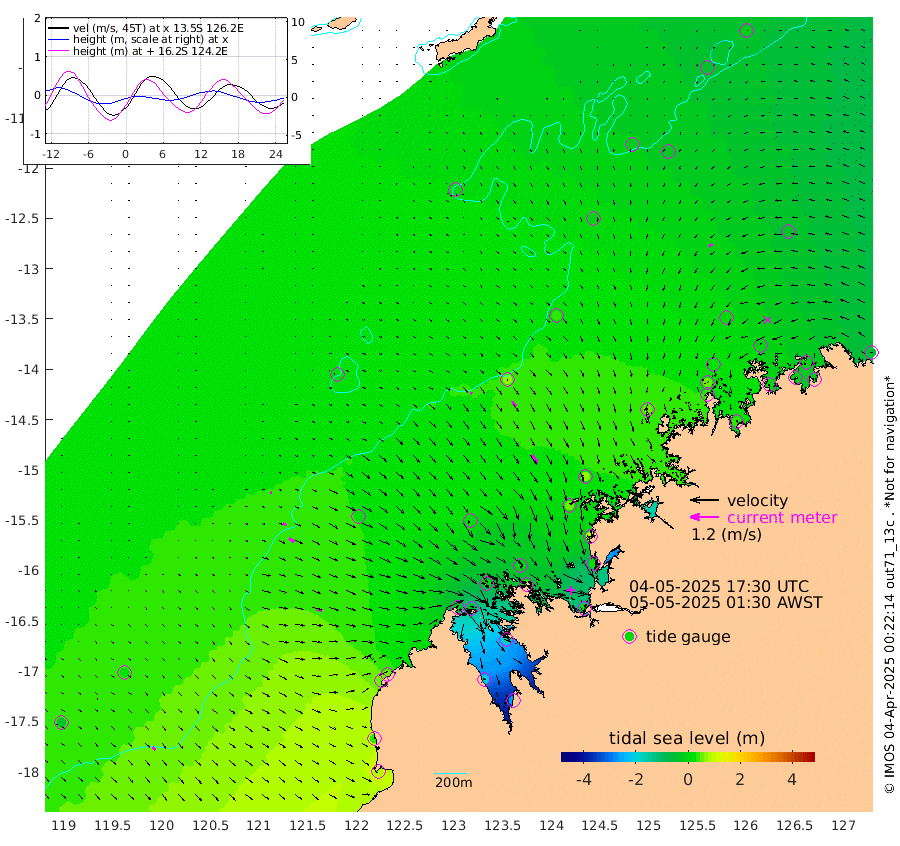 7cm/s 118T +10cm/s rms + 1cm/s 1T. NWSBRW 205m 16cm/s 135T +11cm/s rms + 6cm/s -110T. NWSROW 199m 38cm/s 149T +5cm/s rms + 2cm/s 65T. CAM050 58m 27cm/s 146T +12cm/s rms + 5cm/s 92T. CAM100 99m 6cm/s 118T +7cm/s rms + 1cm/s -85T. KIM400 396m 14cm/s 117T +9cm/s rms + 5cm/s -119T. KIM200 208m 25cm/s 124T +11cm/s rms + 5cm/s -147T. KIM100 99m 23cm/s 102T +8cm/s rms + 3cm/s -103T. KIM050 59m 18cm/s -126T +4cm/s rms + 2cm/s 23T. TIMORS88 91m -34cm Imperieuse Reef 27cm Mermaid Reef 88cm Broome 55cm Cape Baskerville 54cm Red Bluff 41cm Cape Boileau 12cm Scott Reef (WA) 1cm Ashmore Reef -23cm Karrakatta Bay -53cm Sunday Island -209cm Valentine Island -257cm Derby -174cm Port Usborne 6cm Bedford Islands 36cm Yampi Sound (Koolan Island) 12cm Macleay Island 21cm Adele Island 60cm Browse Island 23cm Shale Island 18cm Lizard Island 103cm Hall Point 46cm Degerando Island 69cm White Island -4cm Skua No. 4 Well -24cm Jabiru 51cm Maret Island 53cm Baudin Island 44cm Cape Voltaire (Krait Bay) -36cm Dillon Shoal -8cm Laminaria 42cm Port Warrender -11cm Troughton Island 28cm Cassini Island 11cm West Holothuria Reef Offshore 8cm Jar Island 29cm Lynher Bank 32cm Heywood Shoal -28cm Pee Shoal -33cm Van Cloon Shoal -5cm Carronade Island -7cm Guy Point -17cm Napier Broome Bay -46cm Lesueur Island
