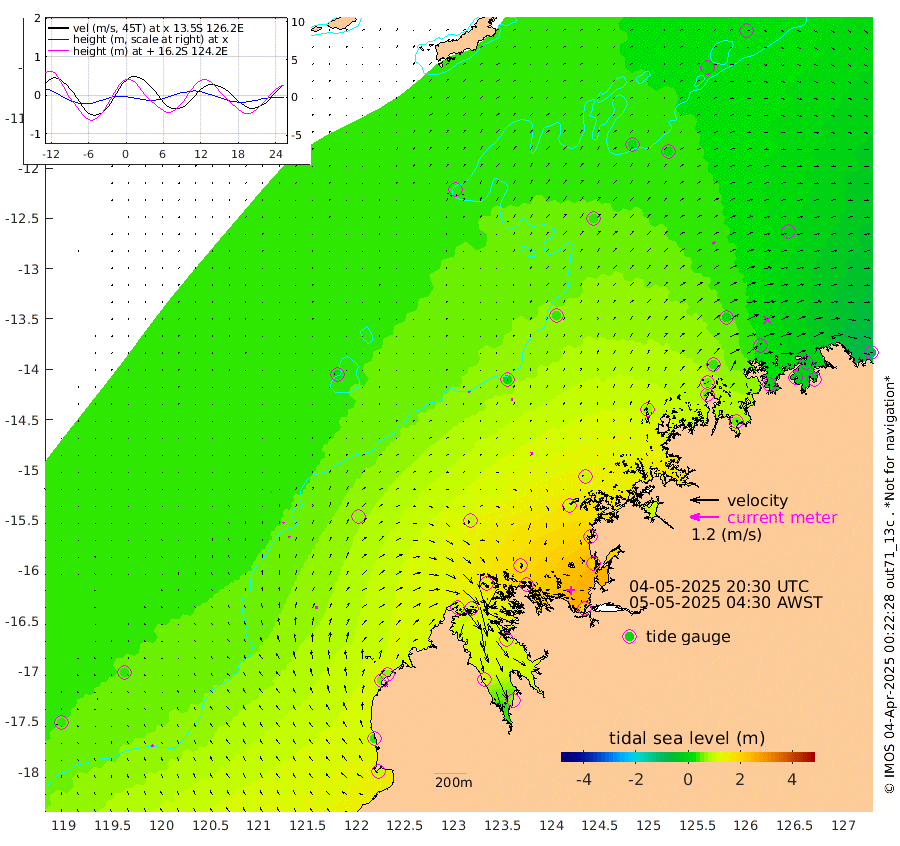 7cm/s -34T +10cm/s rms + 1cm/s 1T. NWSBRW 205m 10cm/s -19T +11cm/s rms + 6cm/s -110T. NWSROW 199m 11cm/s -16T +5cm/s rms + 2cm/s 65T. CAM050 58m 9cm/s -4T +12cm/s rms + 5cm/s 92T. CAM100 99m 3cm/s 49T +7cm/s rms + 1cm/s -85T. KIM400 396m 5cm/s 20T +9cm/s rms + 5cm/s -119T. KIM200 208m 9cm/s 7T +11cm/s rms + 5cm/s -147T. KIM100 99m 14cm/s 0T +8cm/s rms + 3cm/s -103T. KIM050 59m 13cm/s 50T +4cm/s rms + 2cm/s 23T. TIMORS88 91m 39cm Imperieuse Reef 35cm Mermaid Reef 96cm Broome 59cm Cape Baskerville 70cm Red Bluff 43cm Cape Boileau 30cm Scott Reef (WA) 33cm Ashmore Reef 114cm Karrakatta Bay 113cm Sunday Island 107cm Valentine Island 72cm Derby 116cm Port Usborne 129cm Bedford Islands 147cm Yampi Sound (Koolan Island) 166cm Macleay Island 90cm Adele Island 21cm Browse Island 194cm Shale Island 207cm Lizard Island 172cm Hall Point 107cm Degerando Island 104cm White Island 32cm Skua No. 4 Well 26cm Jabiru 69cm Maret Island 56cm Baudin Island 49cm Cape Voltaire (Krait Bay) 9cm Dillon Shoal 24cm Laminaria 53cm Port Warrender 12cm Troughton Island 35cm Cassini Island 21cm West Holothuria Reef Offshore 10cm Jar Island 62cm Lynher Bank 38cm Heywood Shoal 20cm Pee Shoal -14cm Van Cloon Shoal -24cm Carronade Island -24cm Guy Point -35cm Napier Broome Bay -75cm Lesueur Island