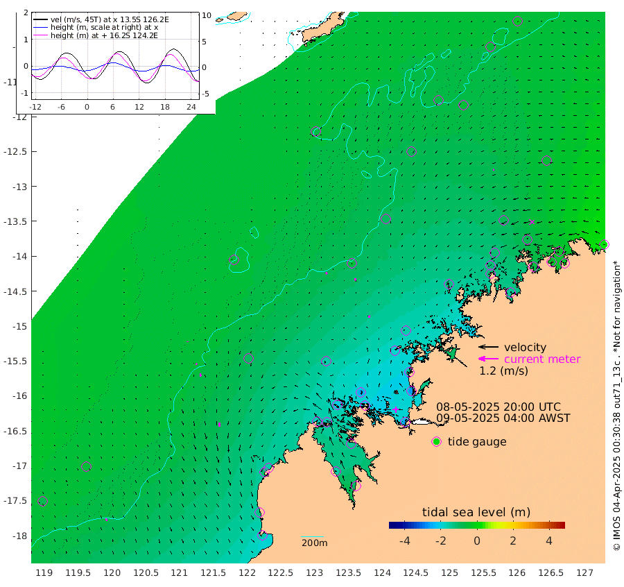 11cm/s 146T +10cm/s rms + 1cm/s 1T. NWSBRW 205m 14cm/s 159T +11cm/s rms + 6cm/s -110T. NWSROW 199m 13cm/s 167T +5cm/s rms + 2cm/s 65T. CAM050 58m 14cm/s 168T +12cm/s rms + 5cm/s 92T. CAM100 99m 4cm/s 180T +7cm/s rms + 1cm/s -85T. KIM400 396m 7cm/s 166T +9cm/s rms + 5cm/s -119T. KIM200 208m 17cm/s 169T +11cm/s rms + 5cm/s -147T. KIM100 99m 21cm/s 177T +8cm/s rms + 3cm/s -103T. KIM050 59m 8cm/s -142T +4cm/s rms + 2cm/s 23T. TIMORS88 91m -78cm Imperieuse Reef -54cm Mermaid Reef -160cm Broome -119cm Cape Baskerville -158cm Red Bluff -130cm Cape Boileau -57cm Scott Reef (WA) -68cm Ashmore Reef -177cm Karrakatta Bay -178cm Sunday Island -155cm Valentine Island -95cm Derby -138cm Port Usborne -202cm Bedford Islands -215cm Yampi Sound (Koolan Island) -249cm Macleay Island -157cm Adele Island -57cm Browse Island -247cm Shale Island -265cm Lizard Island -148cm Hall Point -185cm Degerando Island -159cm White Island -77cm Skua No. 4 Well -60cm Jabiru -134cm Maret Island -108cm Baudin Island -118cm Cape Voltaire (Krait Bay) -56cm Dillon Shoal -26cm Laminaria -145cm Port Warrender -78cm Troughton Island -112cm Cassini Island -78cm West Holothuria Reef Offshore -68cm Jar Island -96cm Lynher Bank -98cm Heywood Shoal -74cm Pee Shoal -50cm Van Cloon Shoal -35cm Carronade Island -34cm Guy Point -45cm Napier Broome Bay 29cm Lesueur Island