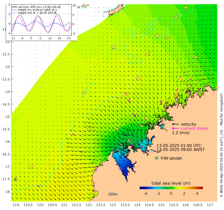 30cm/s 121T +10cm/s rms + 1cm/s 1T. NWSBRW 205m 36cm/s 133T +11cm/s rms + 6cm/s -110T. NWSROW 199m 89cm/s 139T +5cm/s rms + 2cm/s 65T. CAM050 58m 65cm/s 135T +12cm/s rms + 5cm/s 92T. CAM100 99m 13cm/s 111T +7cm/s rms + 1cm/s -85T. KIM400 396m 29cm/s 117T +9cm/s rms + 5cm/s -119T. KIM200 208m 52cm/s 122T +11cm/s rms + 5cm/s -147T. KIM100 99m 62cm/s 100T +8cm/s rms + 3cm/s -103T. KIM050 59m 21cm/s -145T +4cm/s rms + 2cm/s 23T. TIMORS88 91m 3cm Imperieuse Reef 121cm Mermaid Reef 197cm Broome 164cm Cape Baskerville 114cm Red Bluff 153cm Cape Boileau 112cm Scott Reef (WA) 109cm Ashmore Reef 8cm Karrakatta Bay -32cm Sunday Island -285cm Valentine Island -353cm Derby -240cm Port Usborne 51cm Bedford Islands 78cm Yampi Sound (Koolan Island) 112cm Macleay Island 127cm Adele Island 183cm Browse Island 25cm Shale Island 9cm Lizard Island 62cm Hall Point 119cm Degerando Island 150cm White Island 122cm Skua No. 4 Well 75cm Jabiru 174cm Maret Island 173cm Baudin Island 166cm Cape Voltaire (Krait Bay) 74cm Dillon Shoal 110cm Laminaria 153cm Port Warrender 138cm Troughton Island 175cm Cassini Island 145cm West Holothuria Reef Offshore 126cm Jar Island 117cm Lynher Bank 157cm Heywood Shoal 100cm Pee Shoal 91cm Van Cloon Shoal 127cm Carronade Island 132cm Guy Point 129cm Napier Broome Bay 102cm Lesueur Island