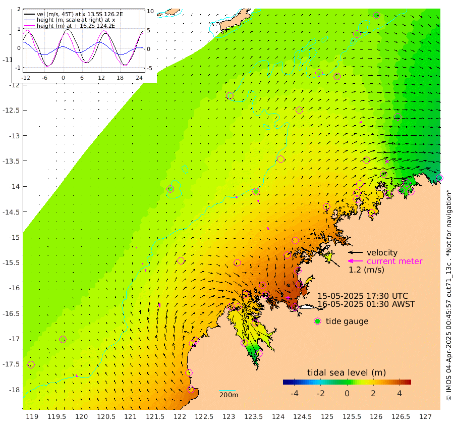 19cm/s -32T +10cm/s rms + 1cm/s 1T. NWSBRW 205m 22cm/s -20T +11cm/s rms + 6cm/s -110T. NWSROW 199m 20cm/s -26T +5cm/s rms + 2cm/s 65T. CAM050 58m 18cm/s -10T +12cm/s rms + 5cm/s 92T. CAM100 99m 5cm/s 13T +7cm/s rms + 1cm/s -85T. KIM400 396m 10cm/s 1T +9cm/s rms + 5cm/s -119T. KIM200 208m 20cm/s -7T +11cm/s rms + 5cm/s -147T. KIM100 99m 33cm/s -3T +8cm/s rms + 3cm/s -103T. KIM050 59m 22cm/s 60T +4cm/s rms + 2cm/s 23T. TIMORS88 91m 95cm Imperieuse Reef 72cm Mermaid Reef 229cm Broome 151cm Cape Baskerville 233cm Red Bluff 141cm Cape Boileau 59cm Scott Reef (WA) 85cm Ashmore Reef 261cm Karrakatta Bay 238cm Sunday Island 155cm Valentine Island 90cm Derby 178cm Port Usborne 267cm Bedford Islands 322cm Yampi Sound (Koolan Island) 330cm Macleay Island 200cm Adele Island 45cm Browse Island 409cm Shale Island 387cm Lizard Island 384cm Hall Point 255cm Degerando Island 232cm White Island 81cm Skua No. 4 Well 69cm Jabiru 173cm Maret Island 150cm Baudin Island 143cm Cape Voltaire (Krait Bay) 55cm Dillon Shoal 37cm Laminaria 156cm Port Warrender 57cm Troughton Island 125cm Cassini Island 77cm West Holothuria Reef Offshore 64cm Jar Island 119cm Lynher Bank 125cm Heywood Shoal 61cm Pee Shoal 13cm Van Cloon Shoal -6cm Carronade Island -9cm Guy Point -12cm Napier Broome Bay -122cm Lesueur Island