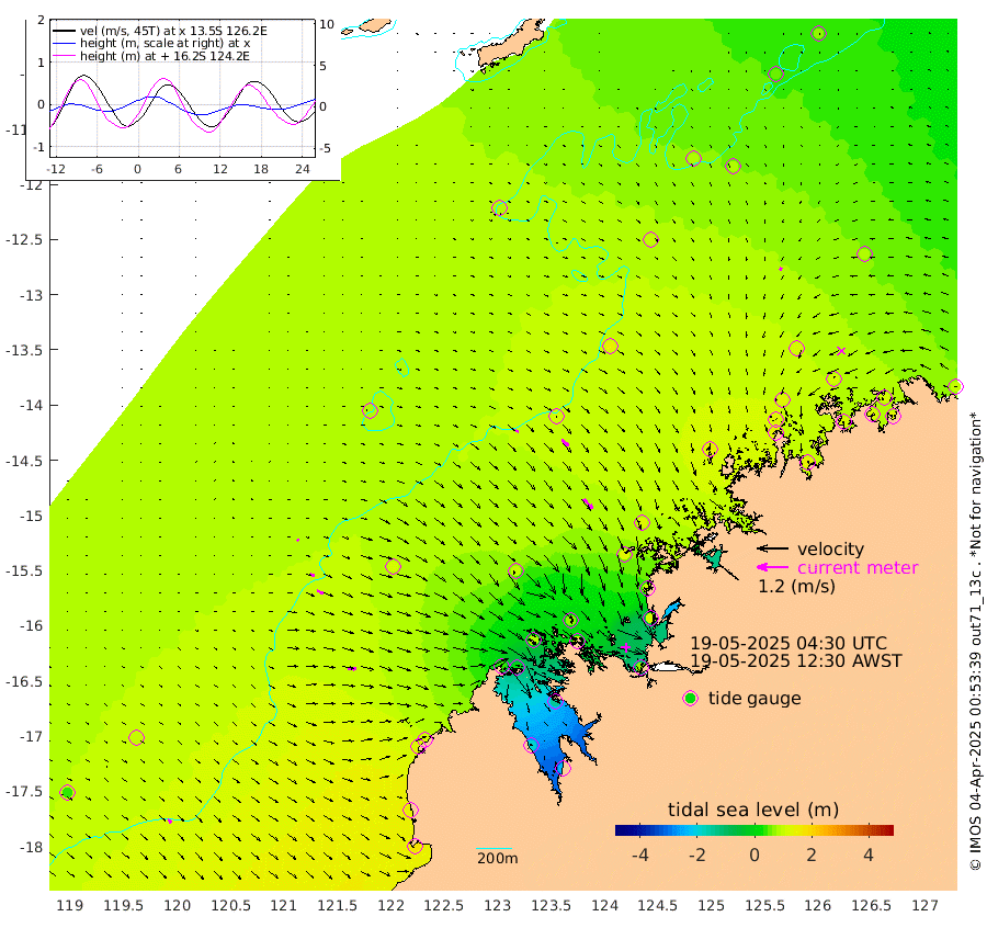 12cm/s 102T +10cm/s rms + 1cm/s 1T. NWSBRW 205m 19cm/s 128T +11cm/s rms + 6cm/s -110T. NWSROW 199m 49cm/s 139T +5cm/s rms + 2cm/s 65T. CAM050 58m 34cm/s 132T +12cm/s rms + 5cm/s 92T. CAM100 99m 7cm/s 107T +7cm/s rms + 1cm/s -85T. KIM400 396m 15cm/s 113T +9cm/s rms + 5cm/s -119T. KIM200 208m 28cm/s 118T +11cm/s rms + 5cm/s -147T. KIM100 99m 35cm/s 93T +8cm/s rms + 3cm/s -103T. KIM050 59m 11cm/s -146T +4cm/s rms + 2cm/s 23T. TIMORS88 91m 30cm Imperieuse Reef 92cm Mermaid Reef 166cm Broome 127cm Cape Baskerville 108cm Red Bluff 139cm Cape Boileau 86cm Scott Reef (WA) 83cm Ashmore Reef 32cm Karrakatta Bay 13cm Sunday Island -183cm Valentine Island -234cm Derby -145cm Port Usborne 76cm Bedford Islands 98cm Yampi Sound (Koolan Island) 74cm Macleay Island 93cm Adele Island 120cm Browse Island 71cm Shale Island 114cm Lizard Island 98cm Hall Point 126cm Degerando Island 135cm White Island 91cm Skua No. 4 Well 82cm Jabiru 142cm Maret Island 128cm Baudin Island 147cm Cape Voltaire (Krait Bay) 53cm Dillon Shoal 74cm Laminaria 149cm Port Warrender 111cm Troughton Island 135cm Cassini Island 108cm West Holothuria Reef Offshore 113cm Jar Island 107cm Lynher Bank 135cm Heywood Shoal 78cm Pee Shoal 85cm Van Cloon Shoal 117cm Carronade Island 120cm Guy Point 130cm Napier Broome Bay 100cm Lesueur Island