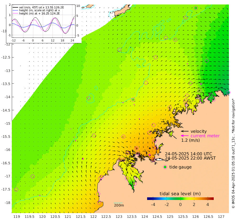 14cm/s -26T +10cm/s rms + 1cm/s 1T. NWSBRW 205m 17cm/s -19T +11cm/s rms + 6cm/s -110T. NWSROW 199m 15cm/s -15T +5cm/s rms + 2cm/s 65T. CAM050 58m 15cm/s -10T +12cm/s rms + 5cm/s 92T. CAM100 99m 5cm/s 8T +7cm/s rms + 1cm/s -85T. KIM400 396m 8cm/s -4T +9cm/s rms + 5cm/s -119T. KIM200 208m 17cm/s -7T +11cm/s rms + 5cm/s -147T. KIM100 99m 28cm/s 0T +8cm/s rms + 3cm/s -103T. KIM050 59m 14cm/s 68T +4cm/s rms + 2cm/s 23T. TIMORS88 91m 87cm Imperieuse Reef 65cm Mermaid Reef 193cm Broome 138cm Cape Baskerville 196cm Red Bluff 139cm Cape Boileau 63cm Scott Reef (WA) 81cm Ashmore Reef 226cm Karrakatta Bay 210cm Sunday Island 153cm Valentine Island 101cm Derby 163cm Port Usborne 237cm Bedford Islands 261cm Yampi Sound (Koolan Island) 303cm Macleay Island 185cm Adele Island 50cm Browse Island 319cm Shale Island 288cm Lizard Island 201cm Hall Point 215cm Degerando Island 181cm White Island 92cm Skua No. 4 Well 63cm Jabiru 153cm Maret Island 125cm Baudin Island 127cm Cape Voltaire (Krait Bay) 71cm Dillon Shoal 41cm Laminaria 132cm Port Warrender 62cm Troughton Island 122cm Cassini Island 75cm West Holothuria Reef Offshore 53cm Jar Island 101cm Lynher Bank 123cm Heywood Shoal 77cm Pee Shoal 25cm Van Cloon Shoal -3cm Carronade Island 0cm Guy Point -1cm Napier Broome Bay -106cm Lesueur Island