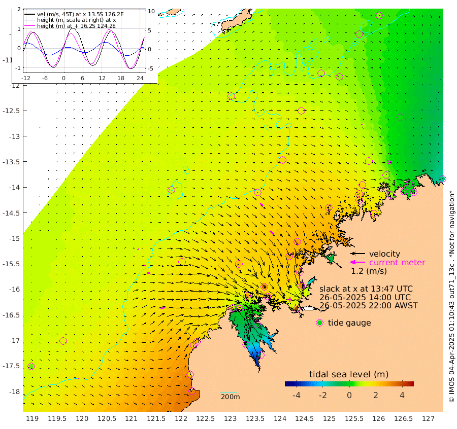 7cm/s 58T +10cm/s rms + 1cm/s 1T. NWSBRW 205m 12cm/s 90T +11cm/s rms + 6cm/s -110T. NWSROW 199m 45cm/s 138T +5cm/s rms + 2cm/s 65T. CAM050 58m 30cm/s 127T +12cm/s rms + 5cm/s 92T. CAM100 99m 10cm/s 86T +7cm/s rms + 1cm/s -85T. KIM400 396m 18cm/s 95T +9cm/s rms + 5cm/s -119T. KIM200 208m 27cm/s 96T +11cm/s rms + 5cm/s -147T. KIM100 99m 44cm/s 65T +8cm/s rms + 3cm/s -103T. KIM050 59m 7cm/s -174T +4cm/s rms + 2cm/s 23T. TIMORS88 91m 56cm Imperieuse Reef 121cm Mermaid Reef 314cm Broome 224cm Cape Baskerville 246cm Red Bluff 218cm Cape Boileau 112cm Scott Reef (WA) 106cm Ashmore Reef 199cm Karrakatta Bay 166cm Sunday Island -94cm Valentine Island -197cm Derby -36cm Port Usborne 264cm Bedford Islands 299cm Yampi Sound (Koolan Island) 352cm Macleay Island 239cm Adele Island 157cm Browse Island 322cm Shale Island 308cm Lizard Island 238cm Hall Point 279cm Degerando Island 266cm White Island 124cm Skua No. 4 Well 69cm Jabiru 234cm Maret Island 200cm Baudin Island 198cm Cape Voltaire (Krait Bay) 56cm Dillon Shoal 70cm Laminaria 192cm Port Warrender 78cm Troughton Island 180cm Cassini Island 113cm West Holothuria Reef Offshore 76cm Jar Island 164cm Lynher Bank 185cm Heywood Shoal 84cm Pee Shoal 19cm Van Cloon Shoal 15cm Carronade Island 19cm Guy Point 17cm Napier Broome Bay -128cm Lesueur Island