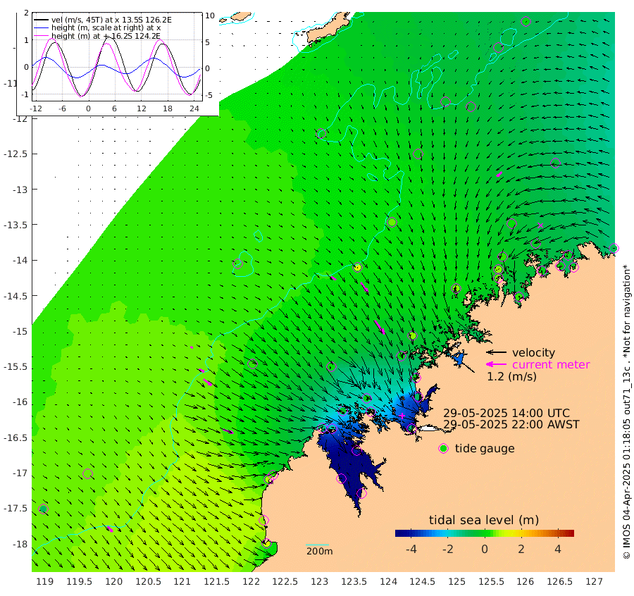 34cm/s 125T +10cm/s rms + 1cm/s 1T. NWSBRW 205m 44cm/s 139T +11cm/s rms + 6cm/s -110T. NWSROW 199m 100cm/s 146T +5cm/s rms + 2cm/s 65T. CAM050 58m 71cm/s 144T +12cm/s rms + 5cm/s 92T. CAM100 99m 15cm/s 122T +7cm/s rms + 1cm/s -85T. KIM400 396m 34cm/s 122T +9cm/s rms + 5cm/s -119T. KIM200 208m 61cm/s 128T +11cm/s rms + 5cm/s -147T. KIM100 99m 66cm/s 111T +8cm/s rms + 3cm/s -103T. KIM050 59m 42cm/s -131T +4cm/s rms + 2cm/s 23T. TIMORS88 91m -93cm Imperieuse Reef 49cm Mermaid Reef 122cm Broome 88cm Cape Baskerville 45cm Red Bluff 74cm Cape Boileau 37cm Scott Reef (WA) -4cm Ashmore Reef -114cm Karrakatta Bay -152cm Sunday Island -434cm Valentine Island -513cm Derby -384cm Port Usborne -43cm Bedford Islands -31cm Yampi Sound (Koolan Island) -7cm Macleay Island 25cm Adele Island 140cm Browse Island -105cm Shale Island -101cm Lizard Island -3cm Hall Point 21cm Degerando Island 63cm White Island 7cm Skua No. 4 Well -39cm Jabiru 68cm Maret Island 62cm Baudin Island 53cm Cape Voltaire (Krait Bay) -58cm Dillon Shoal 5cm Laminaria 36cm Port Warrender -27cm Troughton Island 41cm Cassini Island 17cm West Holothuria Reef Offshore -14cm Jar Island 38cm Lynher Bank 50cm Heywood Shoal -32cm Pee Shoal -52cm Van Cloon Shoal -15cm Carronade Island -13cm Guy Point -22cm Napier Broome Bay -80cm Lesueur Island