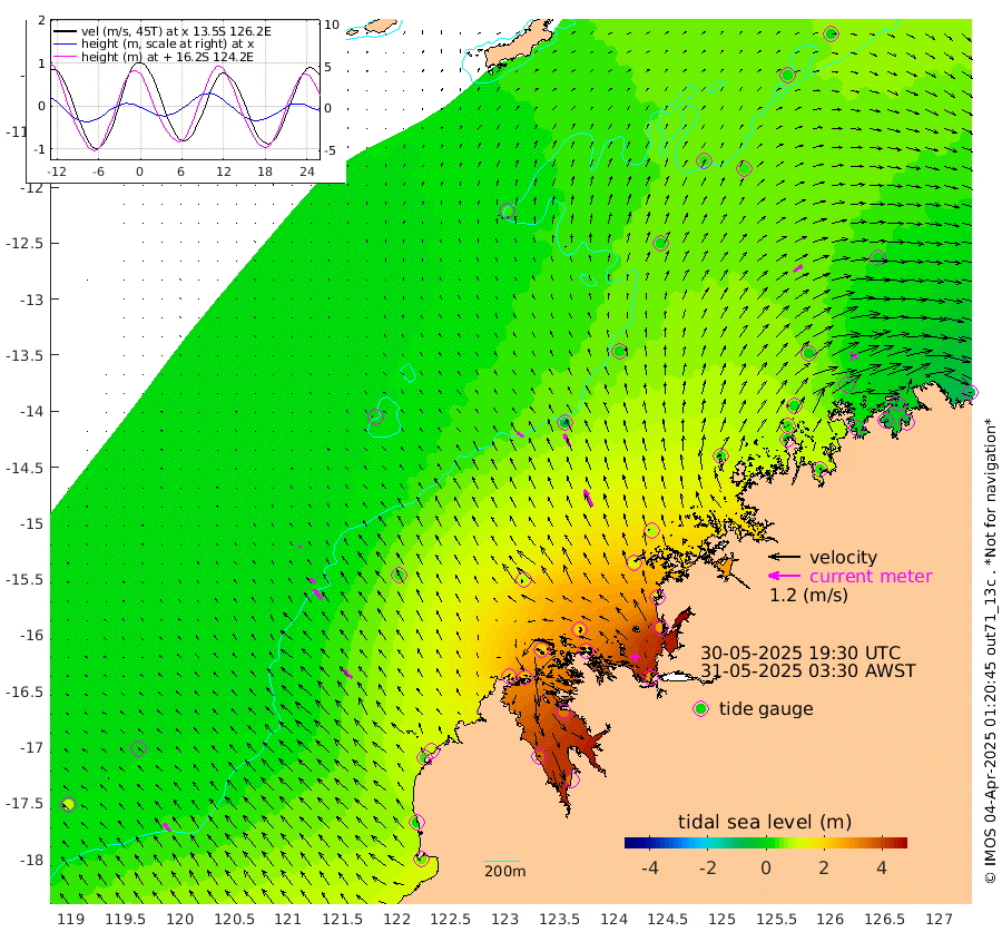 29cm/s -50T +10cm/s rms + 1cm/s 1T. NWSBRW 205m 38cm/s -37T +11cm/s rms + 6cm/s -110T. NWSROW 199m 69cm/s -26T +5cm/s rms + 2cm/s 65T. CAM050 58m 52cm/s -27T +12cm/s rms + 5cm/s 92T. CAM100 99m 9cm/s -37T +7cm/s rms + 1cm/s -85T. KIM400 396m 24cm/s -41T +9cm/s rms + 5cm/s -119T. KIM200 208m 44cm/s -37T +11cm/s rms + 5cm/s -147T. KIM100 99m 47cm/s -46T +8cm/s rms + 3cm/s -103T. KIM050 59m 40cm/s 55T +4cm/s rms + 2cm/s 23T. TIMORS88 91m 94cm Imperieuse Reef 4cm Mermaid Reef 56cm Broome 31cm Cape Baskerville 96cm Red Bluff 19cm Cape Boileau 4cm Scott Reef (WA) 32cm Ashmore Reef 215cm Karrakatta Bay 229cm Sunday Island 351cm Valentine Island 344cm Derby 335cm Port Usborne 202cm Bedford Islands 201cm Yampi Sound (Koolan Island) 206cm Macleay Island 98cm Adele Island -65cm Browse Island 300cm Shale Island 283cm Lizard Island 179cm Hall Point 129cm Degerando Island 82cm White Island 26cm Skua No. 4 Well 33cm Jabiru 44cm Maret Island 31cm Baudin Island 22cm Cape Voltaire (Krait Bay) 30cm Dillon Shoal 8cm Laminaria 32cm Port Warrender 4cm Troughton Island 17cm Cassini Island -1cm West Holothuria Reef Offshore -4cm Jar Island 43cm Lynher Bank 16cm Heywood Shoal 30cm Pee Shoal -9cm Van Cloon Shoal -55cm Carronade Island -58cm Guy Point -62cm Napier Broome Bay -99cm Lesueur Island