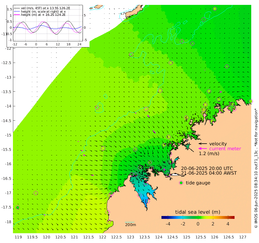 14cm/s 124T +10cm/s rms + 1cm/s 1T. NWSBRW 205m 19cm/s 131T +11cm/s rms + 6cm/s -110T. NWSROW 199m 48cm/s 140T +5cm/s rms + 2cm/s 65T. CAM050 58m 35cm/s 136T +12cm/s rms + 5cm/s 92T. CAM100 99m 8cm/s 110T +7cm/s rms + 1cm/s -85T. KIM400 396m 17cm/s 112T +9cm/s rms + 5cm/s -119T. KIM200 208m 32cm/s 121T +11cm/s rms + 5cm/s -147T. KIM100 99m 35cm/s 97T +8cm/s rms + 3cm/s -103T. KIM050 59m 6cm/s -126T +4cm/s rms + 2cm/s 23T. TIMORS88 91m 4cm Imperieuse Reef 75cm Mermaid Reef 116cm Broome 91cm Cape Baskerville 39cm Red Bluff 75cm Cape Boileau 66cm Scott Reef (WA) 55cm Ashmore Reef -5cm Karrakatta Bay -21cm Sunday Island -166cm Valentine Island -213cm Derby -130cm Port Usborne 41cm Bedford Islands 54cm Yampi Sound (Koolan Island) 47cm Macleay Island 60cm Adele Island 98cm Browse Island 36cm Shale Island 44cm Lizard Island 19cm Hall Point 75cm Degerando Island 95cm White Island 61cm Skua No. 4 Well 32cm Jabiru 94cm Maret Island 93cm Baudin Island 94cm Cape Voltaire (Krait Bay) 26cm Dillon Shoal 67cm Laminaria 89cm Port Warrender 72cm Troughton Island 85cm Cassini Island 71cm West Holothuria Reef Offshore 68cm Jar Island 80cm Lynher Bank 86cm Heywood Shoal 44cm Pee Shoal 37cm Van Cloon Shoal 68cm Carronade Island 74cm Guy Point 61cm Napier Broome Bay 63cm Lesueur Island