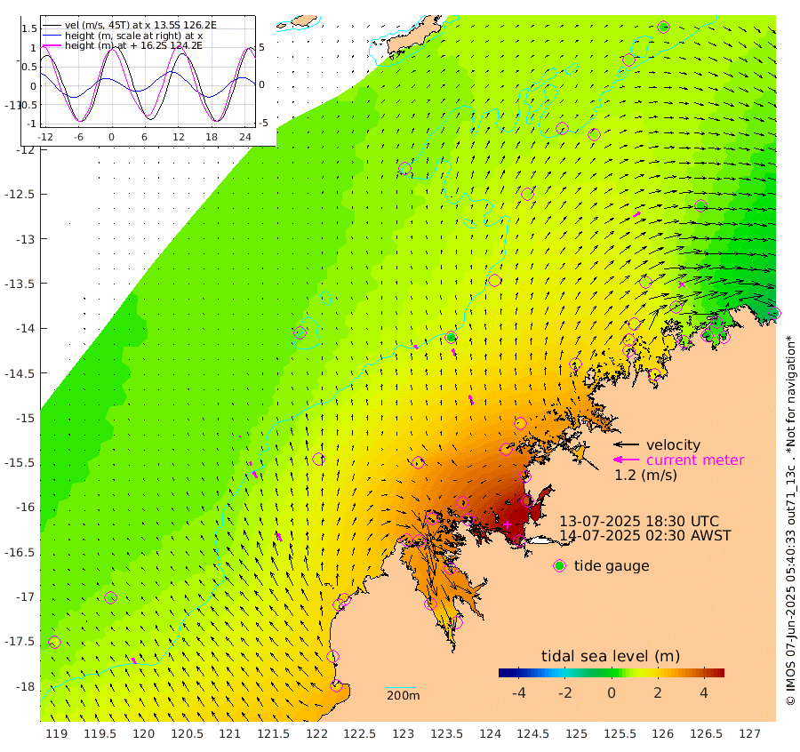 23cm/s -43T +10cm/s rms + 1cm/s 1T. NWSBRW 205m 33cm/s -29T +11cm/s rms + 6cm/s -110T. NWSROW 199m 46cm/s -24T +5cm/s rms + 2cm/s 65T. CAM050 58m 36cm/s -20T +12cm/s rms + 5cm/s 92T. CAM100 99m 8cm/s -19T +7cm/s rms + 1cm/s -85T. KIM400 396m 18cm/s -26T +9cm/s rms + 5cm/s -119T. KIM200 208m 35cm/s -24T +11cm/s rms + 5cm/s -147T. KIM100 99m 42cm/s -22T +8cm/s rms + 3cm/s -103T. KIM050 59m 38cm/s 55T +4cm/s rms + 2cm/s 23T. TIMORS88 91m 120cm Imperieuse Reef 59cm Mermaid Reef 194cm Broome 130cm Cape Baskerville 213cm Red Bluff 117cm Cape Boileau 50cm Scott Reef (WA) 89cm Ashmore Reef 288cm Karrakatta Bay 281cm Sunday Island 272cm Valentine Island 231cm Derby 285cm Port Usborne 284cm Bedford Islands 326cm Yampi Sound (Koolan Island) 335cm Macleay Island 199cm Adele Island 14cm Browse Island 429cm Shale Island 387cm Lizard Island 333cm Hall Point 252cm Degerando Island 211cm White Island 81cm Skua No. 4 Well 74cm Jabiru 154cm Maret Island 137cm Baudin Island 129cm Cape Voltaire (Krait Bay) 74cm Dillon Shoal 37cm Laminaria 147cm Port Warrender 74cm Troughton Island 122cm Cassini Island 79cm West Holothuria Reef Offshore 73cm Jar Island 110cm Lynher Bank 105cm Heywood Shoal 75cm Pee Shoal 35cm Van Cloon Shoal 4cm Carronade Island -3cm Guy Point -1cm Napier Broome Bay -83cm Lesueur Island