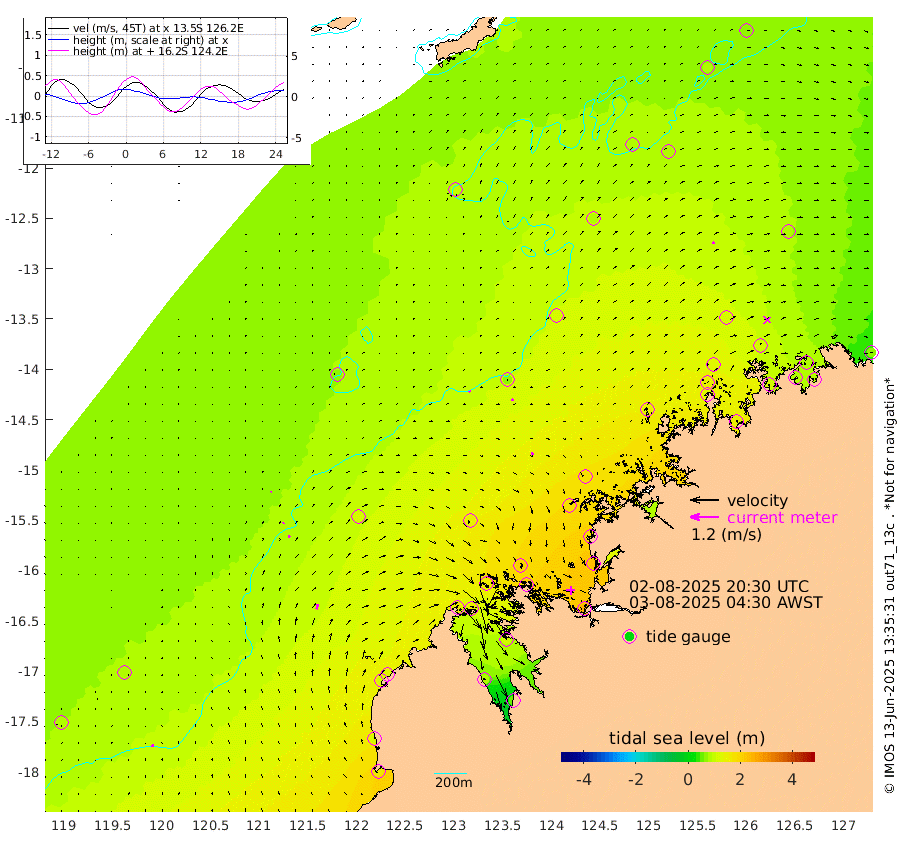 7cm/s -26T +10cm/s rms + 1cm/s 1T. NWSBRW 205m 10cm/s -10T +11cm/s rms + 6cm/s -110T. NWSROW 199m 8cm/s 9T +5cm/s rms + 2cm/s 65T. CAM050 58m 9cm/s 26T +12cm/s rms + 5cm/s 92T. CAM100 99m 4cm/s 31T +7cm/s rms + 1cm/s -85T. KIM400 396m 5cm/s 33T +9cm/s rms + 5cm/s -119T. KIM200 208m 11cm/s 19T +11cm/s rms + 5cm/s -147T. KIM100 99m 21cm/s 14T +8cm/s rms + 3cm/s -103T. KIM050 59m 9cm/s 35T +4cm/s rms + 2cm/s 23T. TIMORS88 91m 82cm Imperieuse Reef 78cm Mermaid Reef 160cm Broome 117cm Cape Baskerville 132cm Red Bluff 109cm Cape Boileau 67cm Scott Reef (WA) 91cm Ashmore Reef 162cm Karrakatta Bay 153cm Sunday Island 89cm Valentine Island 56cm Derby 107cm Port Usborne 159cm Bedford Islands 211cm Yampi Sound (Koolan Island) 203cm Macleay Island 140cm Adele Island 63cm Browse Island 253cm Shale Island 239cm Lizard Island 175cm Hall Point 171cm Degerando Island 176cm White Island 87cm Skua No. 4 Well 78cm Jabiru 137cm Maret Island 143cm Baudin Island 134cm Cape Voltaire (Krait Bay) 80cm Dillon Shoal 68cm Laminaria 148cm Port Warrender 115cm Troughton Island 127cm Cassini Island 108cm West Holothuria Reef Offshore 117cm Jar Island 105cm Lynher Bank 112cm Heywood Shoal 79cm Pee Shoal 77cm Van Cloon Shoal 85cm Carronade Island 86cm Guy Point 83cm Napier Broome Bay 63cm Lesueur Island