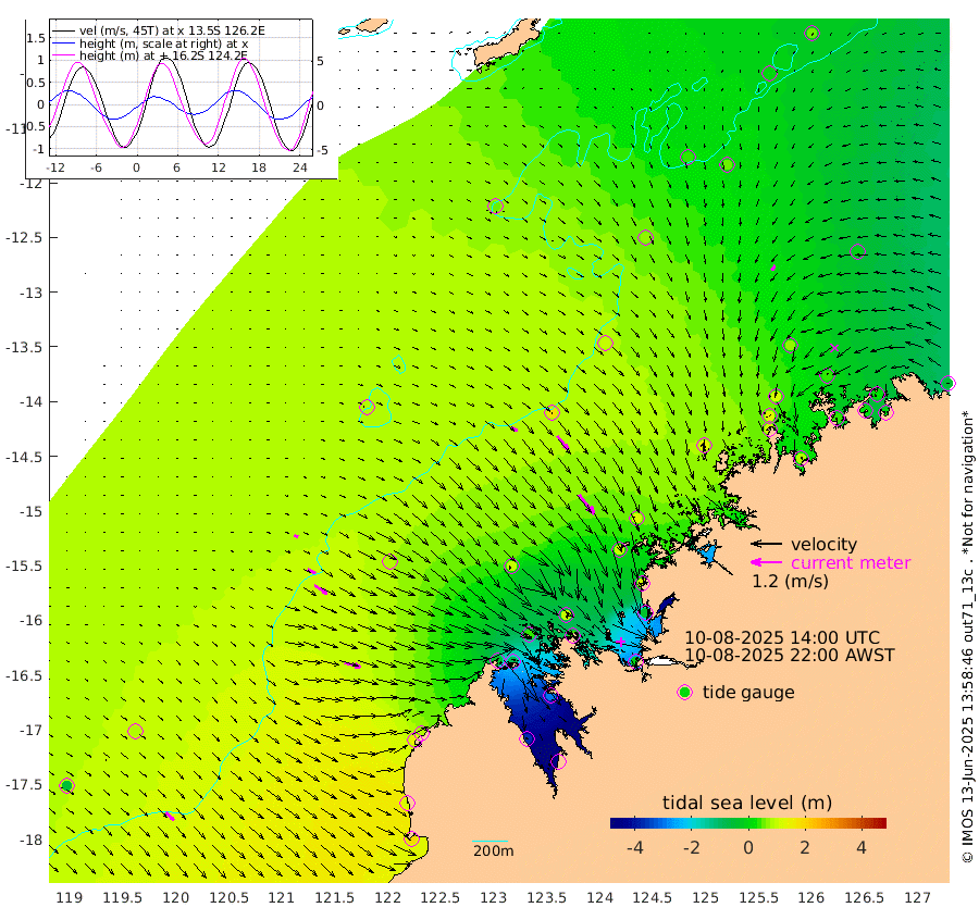 27cm/s 121T +10cm/s rms + 1cm/s 1T. NWSBRW 205m 40cm/s 136T +11cm/s rms + 6cm/s -110T. NWSROW 199m 97cm/s 142T +5cm/s rms + 2cm/s 65T. CAM050 58m 69cm/s 140T +12cm/s rms + 5cm/s 92T. CAM100 99m 15cm/s 115T +7cm/s rms + 1cm/s -85T. KIM400 396m 33cm/s 118T +9cm/s rms + 5cm/s -119T. KIM200 208m 59cm/s 124T +11cm/s rms + 5cm/s -147T. KIM100 99m 65cm/s 105T +8cm/s rms + 3cm/s -103T. KIM050 59m 23cm/s -144T +4cm/s rms + 2cm/s 23T. TIMORS88 91m -45cm Imperieuse Reef 89cm Mermaid Reef 184cm Broome 140cm Cape Baskerville 80cm Red Bluff 119cm Cape Boileau 81cm Scott Reef (WA) 54cm Ashmore Reef -31cm Karrakatta Bay -81cm Sunday Island -367cm Valentine Island -441cm Derby -298cm Port Usborne 36cm Bedford Islands 43cm Yampi Sound (Koolan Island) 99cm Macleay Island 97cm Adele Island 173cm Browse Island -6cm Shale Island -31cm Lizard Island 119cm Hall Point 92cm Degerando Island 112cm White Island 74cm Skua No. 4 Well 47cm Jabiru 135cm Maret Island 121cm Baudin Island 110cm Cape Voltaire (Krait Bay) 2cm Dillon Shoal 59cm Laminaria 77cm Port Warrender 40cm Troughton Island 111cm Cassini Island 68cm West Holothuria Reef Offshore 32cm Jar Island 85cm Lynher Bank 105cm Heywood Shoal 33cm Pee Shoal -7cm Van Cloon Shoal 19cm Carronade Island 22cm Guy Point 13cm Napier Broome Bay -49cm Lesueur Island