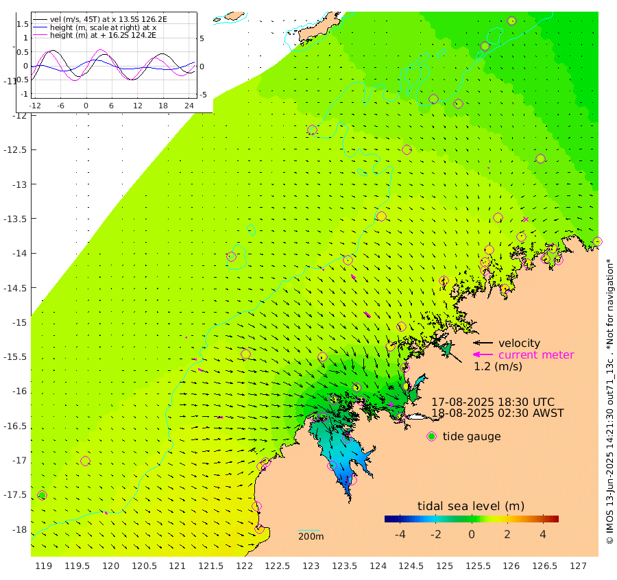 12cm/s 112T +10cm/s rms + 1cm/s 1T. NWSBRW 205m 17cm/s 124T +11cm/s rms + 6cm/s -110T. NWSROW 199m 46cm/s 137T +5cm/s rms + 2cm/s 65T. CAM050 58m 34cm/s 130T +12cm/s rms + 5cm/s 92T. CAM100 99m 7cm/s 101T +7cm/s rms + 1cm/s -85T. KIM400 396m 17cm/s 109T +9cm/s rms + 5cm/s -119T. KIM200 208m 30cm/s 115T +11cm/s rms + 5cm/s -147T. KIM100 99m 36cm/s 86T +8cm/s rms + 3cm/s -103T. KIM050 59m 5cm/s -171T +4cm/s rms + 2cm/s 23T. TIMORS88 91m 34cm Imperieuse Reef 102cm Mermaid Reef 180cm Broome 139cm Cape Baskerville 120cm Red Bluff 136cm Cape Boileau 89cm Scott Reef (WA) 86cm Ashmore Reef 47cm Karrakatta Bay 38cm Sunday Island -166cm Valentine Island -221cm Derby -126cm Port Usborne 96cm Bedford Islands 131cm Yampi Sound (Koolan Island) 97cm Macleay Island 108cm Adele Island 113cm Browse Island 114cm Shale Island 124cm Lizard Island 92cm Hall Point 146cm Degerando Island 164cm White Island 89cm Skua No. 4 Well 66cm Jabiru 146cm Maret Island 144cm Baudin Island 154cm Cape Voltaire (Krait Bay) 63cm Dillon Shoal 85cm Laminaria 165cm Port Warrender 114cm Troughton Island 138cm Cassini Island 118cm West Holothuria Reef Offshore 120cm Jar Island 118cm Lynher Bank 145cm Heywood Shoal 74cm Pee Shoal 80cm Van Cloon Shoal 117cm Carronade Island 124cm Guy Point 119cm Napier Broome Bay 98cm Lesueur Island