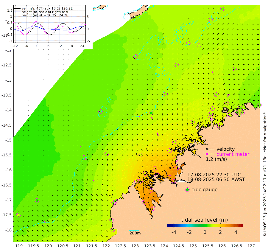 19cm/s -43T +10cm/s rms + 1cm/s 1T. NWSBRW 205m 23cm/s -32T +11cm/s rms + 6cm/s -110T. NWSROW 199m 42cm/s -27T +5cm/s rms + 2cm/s 65T. CAM050 58m 32cm/s -24T +12cm/s rms + 5cm/s 92T. CAM100 99m 6cm/s -27T +7cm/s rms + 1cm/s -85T. KIM400 396m 13cm/s -37T +9cm/s rms + 5cm/s -119T. KIM200 208m 27cm/s -29T +11cm/s rms + 5cm/s -147T. KIM100 99m 31cm/s -40T +8cm/s rms + 3cm/s -103T. KIM050 59m 14cm/s 18T +4cm/s rms + 2cm/s 23T. TIMORS88 91m 100cm Imperieuse Reef 41cm Mermaid Reef 76cm Broome 53cm Cape Baskerville 51cm Red Bluff 56cm Cape Boileau 46cm Scott Reef (WA) 71cm Ashmore Reef 165cm Karrakatta Bay 173cm Sunday Island 278cm Valentine Island 274cm Derby 263cm Port Usborne 149cm Bedford Islands 169cm Yampi Sound (Koolan Island) 198cm Macleay Island 108cm Adele Island 15cm Browse Island 225cm Shale Island 248cm Lizard Island 116cm Hall Point 119cm Degerando Island 102cm White Island 75cm Skua No. 4 Well 94cm Jabiru 86cm Maret Island 72cm Baudin Island 80cm Cape Voltaire (Krait Bay) 77cm Dillon Shoal 48cm Laminaria 93cm Port Warrender 100cm Troughton Island 79cm Cassini Island 68cm West Holothuria Reef Offshore 79cm Jar Island 71cm Lynher Bank 60cm Heywood Shoal 81cm Pee Shoal 68cm Van Cloon Shoal 56cm Carronade Island 57cm Guy Point 58cm Napier Broome Bay 54cm Lesueur Island
