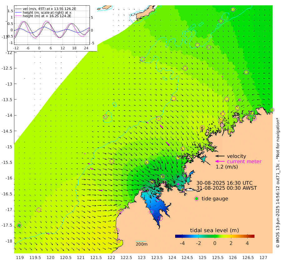 19cm/s 116T +10cm/s rms + 1cm/s 1T. NWSBRW 205m 26cm/s 132T +11cm/s rms + 6cm/s -110T. NWSROW 199m 69cm/s 139T +5cm/s rms + 2cm/s 65T. CAM050 58m 49cm/s 134T +12cm/s rms + 5cm/s 92T. CAM100 99m 9cm/s 109T +7cm/s rms + 1cm/s -85T. KIM400 396m 22cm/s 112T +9cm/s rms + 5cm/s -119T. KIM200 208m 40cm/s 119T +11cm/s rms + 5cm/s -147T. KIM100 99m 48cm/s 95T +8cm/s rms + 3cm/s -103T. KIM050 59m 9cm/s -179T +4cm/s rms + 2cm/s 23T. TIMORS88 91m 13cm Imperieuse Reef 99cm Mermaid Reef 189cm Broome 155cm Cape Baskerville 135cm Red Bluff 143cm Cape Boileau 87cm Scott Reef (WA) 87cm Ashmore Reef 34cm Karrakatta Bay -7cm Sunday Island -247cm Valentine Island -317cm Derby -205cm Port Usborne 82cm Bedford Islands 98cm Yampi Sound (Koolan Island) 87cm Macleay Island 108cm Adele Island 136cm Browse Island 68cm Shale Island 37cm Lizard Island 87cm Hall Point 135cm Degerando Island 141cm White Island 96cm Skua No. 4 Well 64cm Jabiru 154cm Maret Island 154cm Baudin Island 150cm Cape Voltaire (Krait Bay) 55cm Dillon Shoal 80cm Laminaria 143cm Port Warrender 108cm Troughton Island 153cm Cassini Island 114cm West Holothuria Reef Offshore 106cm Jar Island 103cm Lynher Bank 142cm Heywood Shoal 75cm Pee Shoal 69cm Van Cloon Shoal 97cm Carronade Island 100cm Guy Point 100cm Napier Broome Bay 70cm Lesueur Island