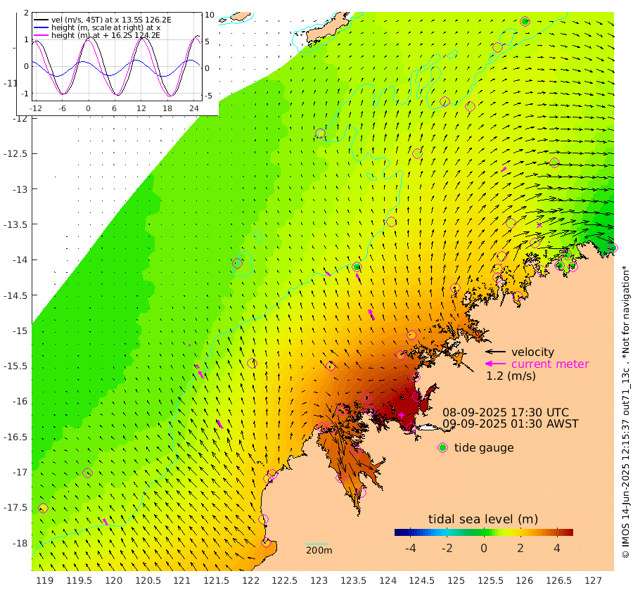 33cm/s -46T +10cm/s rms + 1cm/s 1T. NWSBRW 205m 44cm/s -31T +11cm/s rms + 6cm/s -110T. NWSROW 199m 68cm/s -28T +5cm/s rms + 2cm/s 65T. CAM050 58m 53cm/s -26T +12cm/s rms + 5cm/s 92T. CAM100 99m 12cm/s -32T +7cm/s rms + 1cm/s -85T. KIM400 396m 25cm/s -35T +9cm/s rms + 5cm/s -119T. KIM200 208m 50cm/s -30T +11cm/s rms + 5cm/s -147T. KIM100 99m 57cm/s -33T +8cm/s rms + 3cm/s -103T. KIM050 59m 37cm/s 50T +4cm/s rms + 2cm/s 23T. TIMORS88 91m 152cm Imperieuse Reef 55cm Mermaid Reef 209cm Broome 143cm Cape Baskerville 244cm Red Bluff 138cm Cape Boileau 47cm Scott Reef (WA) 99cm Ashmore Reef 343cm Karrakatta Bay 336cm Sunday Island 370cm Valentine Island 323cm Derby 362cm Port Usborne 332cm Bedford Islands 379cm Yampi Sound (Koolan Island) 376cm Macleay Island 222cm Adele Island 6cm Browse Island 494cm Shale Island 453cm Lizard Island 340cm Hall Point 291cm Degerando Island 239cm White Island 89cm Skua No. 4 Well 87cm Jabiru 174cm Maret Island 159cm Baudin Island 153cm Cape Voltaire (Krait Bay) 89cm Dillon Shoal 23cm Laminaria 189cm Port Warrender 108cm Troughton Island 147cm Cassini Island 98cm West Holothuria Reef Offshore 106cm Jar Island 120cm Lynher Bank 113cm Heywood Shoal 91cm Pee Shoal 63cm Van Cloon Shoal 31cm Carronade Island 21cm Guy Point 30cm Napier Broome Bay -45cm Lesueur Island