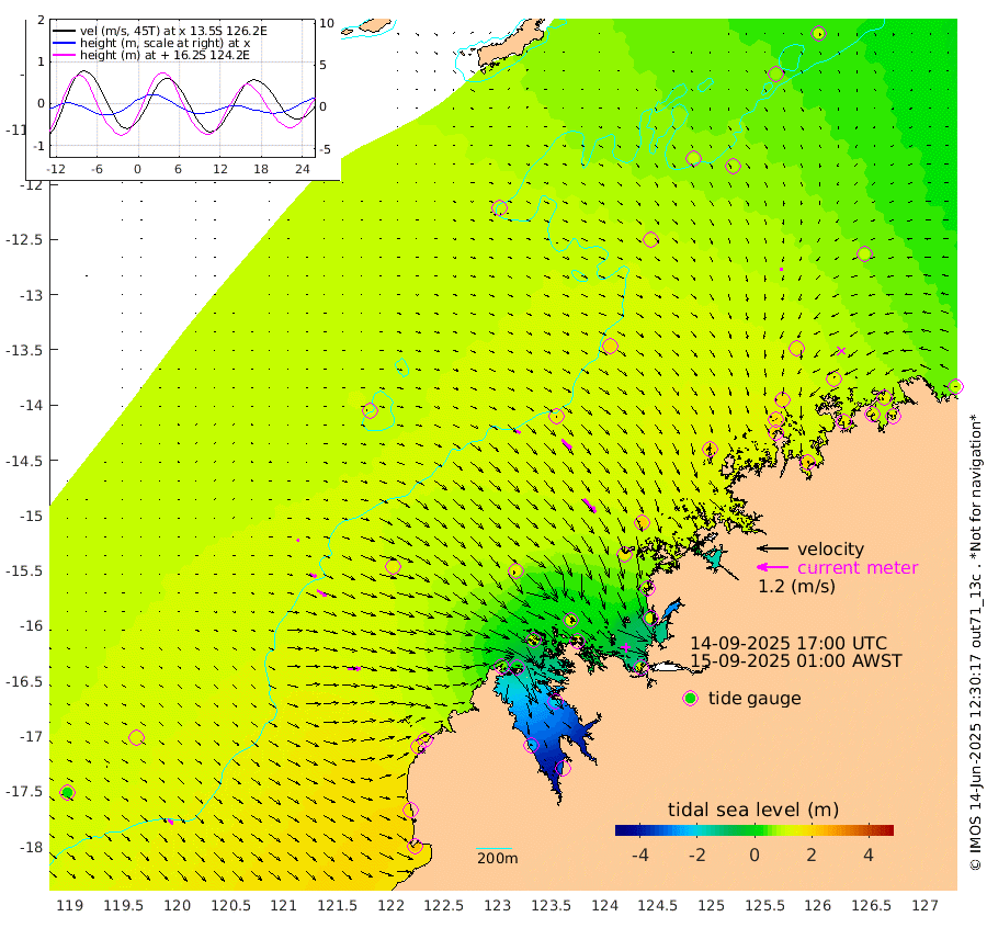 19cm/s 113T +10cm/s rms + 1cm/s 1T. NWSBRW 205m 26cm/s 129T +11cm/s rms + 6cm/s -110T. NWSROW 199m 68cm/s 138T +5cm/s rms + 2cm/s 65T. CAM050 58m 49cm/s 132T +12cm/s rms + 5cm/s 92T. CAM100 99m 10cm/s 105T +7cm/s rms + 1cm/s -85T. KIM400 396m 23cm/s 112T +9cm/s rms + 5cm/s -119T. KIM200 208m 41cm/s 118T +11cm/s rms + 5cm/s -147T. KIM100 99m 50cm/s 91T +8cm/s rms + 3cm/s -103T. KIM050 59m 11cm/s -163T +4cm/s rms + 2cm/s 23T. TIMORS88 91m 29cm Imperieuse Reef 123cm Mermaid Reef 228cm Broome 179cm Cape Baskerville 159cm Red Bluff 178cm Cape Boileau 110cm Scott Reef (WA) 104cm Ashmore Reef 47cm Karrakatta Bay 29cm Sunday Island -246cm Valentine Island -318cm Derby -197cm Port Usborne 109cm Bedford Islands 148cm Yampi Sound (Koolan Island) 122cm Macleay Island 137cm Adele Island 154cm Browse Island 113cm Shale Island 119cm Lizard Island 132cm Hall Point 177cm Degerando Island 197cm White Island 110cm Skua No. 4 Well 82cm Jabiru 185cm Maret Island 180cm Baudin Island 190cm Cape Voltaire (Krait Bay) 74cm Dillon Shoal 98cm Laminaria 202cm Port Warrender 135cm Troughton Island 176cm Cassini Island 146cm West Holothuria Reef Offshore 141cm Jar Island 140cm Lynher Bank 180cm Heywood Shoal 91cm Pee Shoal 96cm Van Cloon Shoal 138cm Carronade Island 146cm Guy Point 144cm Napier Broome Bay 104cm Lesueur Island