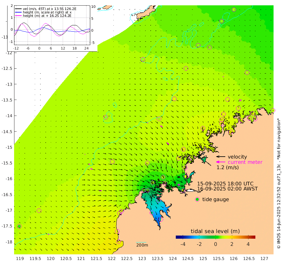 10cm/s 104T +10cm/s rms + 1cm/s 1T. NWSBRW 205m 15cm/s 122T +11cm/s rms + 6cm/s -110T. NWSROW 199m 40cm/s 136T +5cm/s rms + 2cm/s 65T. CAM050 58m 29cm/s 128T +12cm/s rms + 5cm/s 92T. CAM100 99m 6cm/s 99T +7cm/s rms + 1cm/s -85T. KIM400 396m 15cm/s 110T +9cm/s rms + 5cm/s -119T. KIM200 208m 25cm/s 115T +11cm/s rms + 5cm/s -147T. KIM100 99m 31cm/s 83T +8cm/s rms + 3cm/s -103T. KIM050 59m 6cm/s -173T +4cm/s rms + 2cm/s 23T. TIMORS88 91m 38cm Imperieuse Reef 96cm Mermaid Reef 176cm Broome 135cm Cape Baskerville 130cm Red Bluff 138cm Cape Boileau 83cm Scott Reef (WA) 84cm Ashmore Reef 57cm Karrakatta Bay 50cm Sunday Island -152cm Valentine Island -200cm Derby -114cm Port Usborne 96cm Bedford Islands 136cm Yampi Sound (Koolan Island) 95cm Macleay Island 106cm Adele Island 104cm Browse Island 120cm Shale Island 134cm Lizard Island 121cm Hall Point 147cm Degerando Island 165cm White Island 84cm Skua No. 4 Well 74cm Jabiru 142cm Maret Island 144cm Baudin Island 152cm Cape Voltaire (Krait Bay) 65cm Dillon Shoal 79cm Laminaria 167cm Port Warrender 112cm Troughton Island 136cm Cassini Island 118cm West Holothuria Reef Offshore 124cm Jar Island 114cm Lynher Bank 143cm Heywood Shoal 72cm Pee Shoal 86cm Van Cloon Shoal 121cm Carronade Island 127cm Guy Point 127cm Napier Broome Bay 103cm Lesueur Island