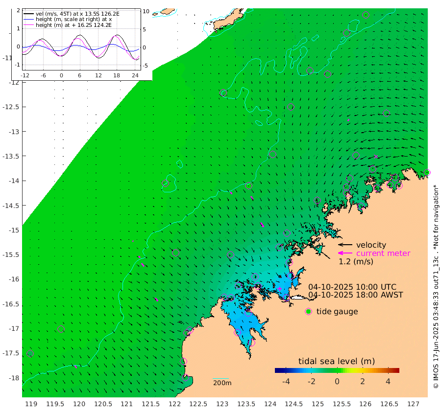 20cm/s 132T +10cm/s rms + 1cm/s 1T. NWSBRW 205m 26cm/s 146T +11cm/s rms + 6cm/s -110T. NWSROW 199m 45cm/s 148T +5cm/s rms + 2cm/s 65T. CAM050 58m 34cm/s 149T +12cm/s rms + 5cm/s 92T. CAM100 99m 8cm/s 135T +7cm/s rms + 1cm/s -85T. KIM400 396m 16cm/s 132T +9cm/s rms + 5cm/s -119T. KIM200 208m 32cm/s 141T +11cm/s rms + 5cm/s -147T. KIM100 99m 33cm/s 135T +8cm/s rms + 3cm/s -103T. KIM050 59m 18cm/s -132T +4cm/s rms + 2cm/s 23T. TIMORS88 91m -79cm Imperieuse Reef -13cm Mermaid Reef -65cm Broome -50cm Cape Baskerville -122cm Red Bluff -66cm Cape Boileau -14cm Scott Reef (WA) -40cm Ashmore Reef -151cm Karrakatta Bay -164cm Sunday Island -224cm Valentine Island -208cm Derby -190cm Port Usborne -138cm Bedford Islands -156cm Yampi Sound (Koolan Island) -141cm Macleay Island -87cm Adele Island 24cm Browse Island -200cm Shale Island -198cm Lizard Island -132cm Hall Point -120cm Degerando Island -91cm White Island -34cm Skua No. 4 Well -39cm Jabiru -62cm Maret Island -53cm Baudin Island -64cm Cape Voltaire (Krait Bay) -56cm Dillon Shoal -2cm Laminaria -100cm Port Warrender -56cm Troughton Island -61cm Cassini Island -48cm West Holothuria Reef Offshore -56cm Jar Island -42cm Lynher Bank -54cm Heywood Shoal -49cm Pee Shoal -53cm Van Cloon Shoal -37cm Carronade Island -35cm Guy Point -47cm Napier Broome Bay -11cm Lesueur Island