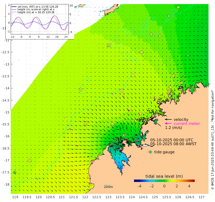 18cm/s 121T +10cm/s rms + 1cm/s 1T. NWSBRW 205m 23cm/s 133T +11cm/s rms + 6cm/s -110T. NWSROW 199m 61cm/s 139T +5cm/s rms + 2cm/s 65T. CAM050 58m 43cm/s 137T +12cm/s rms + 5cm/s 92T. CAM100 99m 10cm/s 108T +7cm/s rms + 1cm/s -85T. KIM400 396m 20cm/s 116T +9cm/s rms + 5cm/s -119T. KIM200 208m 35cm/s 121T +11cm/s rms + 5cm/s -147T. KIM100 99m 44cm/s 99T +8cm/s rms + 3cm/s -103T. KIM050 59m 11cm/s -121T +4cm/s rms + 2cm/s 23T. TIMORS88 91m 6cm Imperieuse Reef 85cm Mermaid Reef 150cm Broome 116cm Cape Baskerville 79cm Red Bluff 121cm Cape Boileau 85cm Scott Reef (WA) 72cm Ashmore Reef 23cm Karrakatta Bay -9cm Sunday Island -171cm Valentine Island -226cm Derby -137cm Port Usborne 50cm Bedford Islands 69cm Yampi Sound (Koolan Island) 127cm Macleay Island 105cm Adele Island 136cm Browse Island 46cm Shale Island 68cm Lizard Island 79cm Hall Point 95cm Degerando Island 108cm White Island 95cm Skua No. 4 Well 67cm Jabiru 125cm Maret Island 103cm Baudin Island 113cm Cape Voltaire (Krait Bay) 50cm Dillon Shoal 75cm Laminaria 95cm Port Warrender 76cm Troughton Island 114cm Cassini Island 87cm West Holothuria Reef Offshore 63cm Jar Island 85cm Lynher Bank 117cm Heywood Shoal 73cm Pee Shoal 44cm Van Cloon Shoal 57cm Carronade Island 64cm Guy Point 69cm Napier Broome Bay 4cm Lesueur Island