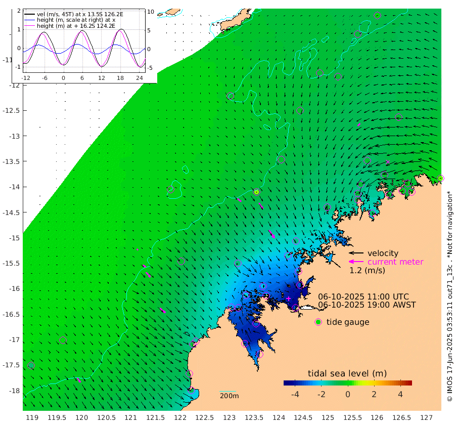 37cm/s 131T +10cm/s rms + 1cm/s 1T. NWSBRW 205m 44cm/s 145T +11cm/s rms + 6cm/s -110T. NWSROW 199m 81cm/s 146T +5cm/s rms + 2cm/s 65T. CAM050 58m 61cm/s 147T +12cm/s rms + 5cm/s 92T. CAM100 99m 13cm/s 135T +7cm/s rms + 1cm/s -85T. KIM400 396m 28cm/s 131T +9cm/s rms + 5cm/s -119T. KIM200 208m 54cm/s 139T +11cm/s rms + 5cm/s -147T. KIM100 99m 58cm/s 130T +8cm/s rms + 3cm/s -103T. KIM050 59m 29cm/s -135T +4cm/s rms + 2cm/s 23T. TIMORS88 91m -113cm Imperieuse Reef 1cm Mermaid Reef -80cm Broome -46cm Cape Baskerville -156cm Red Bluff -63cm Cape Boileau 2cm Scott Reef (WA) -39cm Ashmore Reef -243cm Karrakatta Bay -255cm Sunday Island -357cm Valentine Island -353cm Derby -330cm Port Usborne -208cm Bedford Islands -240cm Yampi Sound (Koolan Island) -219cm Macleay Island -114cm Adele Island 61cm Browse Island -333cm Shale Island -320cm Lizard Island -213cm Hall Point -166cm Degerando Island -120cm White Island -27cm Skua No. 4 Well -38cm Jabiru -67cm Maret Island -56cm Baudin Island -61cm Cape Voltaire (Krait Bay) -55cm Dillon Shoal 19cm Laminaria -98cm Port Warrender -39cm Troughton Island -54cm Cassini Island -33cm West Holothuria Reef Offshore -47cm Jar Island -44cm Lynher Bank -44cm Heywood Shoal -41cm Pee Shoal -35cm Van Cloon Shoal -1cm Carronade Island 7cm Guy Point -10cm Napier Broome Bay 47cm Lesueur Island