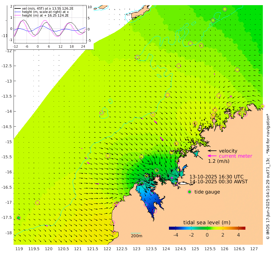 19cm/s 112T +10cm/s rms + 1cm/s 1T. NWSBRW 205m 25cm/s 130T +11cm/s rms + 6cm/s -110T. NWSROW 199m 64cm/s 139T +5cm/s rms + 2cm/s 65T. CAM050 58m 46cm/s 133T +12cm/s rms + 5cm/s 92T. CAM100 99m 9cm/s 108T +7cm/s rms + 1cm/s -85T. KIM400 396m 21cm/s 115T +9cm/s rms + 5cm/s -119T. KIM200 208m 38cm/s 120T +11cm/s rms + 5cm/s -147T. KIM100 99m 45cm/s 94T +8cm/s rms + 3cm/s -103T. KIM050 59m 14cm/s -158T +4cm/s rms + 2cm/s 23T. TIMORS88 91m 21cm Imperieuse Reef 109cm Mermaid Reef 196cm Broome 155cm Cape Baskerville 142cm Red Bluff 160cm Cape Boileau 96cm Scott Reef (WA) 93cm Ashmore Reef 30cm Karrakatta Bay 14cm Sunday Island -244cm Valentine Island -302cm Derby -201cm Port Usborne 77cm Bedford Islands 115cm Yampi Sound (Koolan Island) 86cm Macleay Island 113cm Adele Island 138cm Browse Island 75cm Shale Island 86cm Lizard Island 127cm Hall Point 145cm Degerando Island 169cm White Island 96cm Skua No. 4 Well 79cm Jabiru 161cm Maret Island 161cm Baudin Island 168cm Cape Voltaire (Krait Bay) 67cm Dillon Shoal 88cm Laminaria 179cm Port Warrender 122cm Troughton Island 156cm Cassini Island 134cm West Holothuria Reef Offshore 132cm Jar Island 121cm Lynher Bank 160cm Heywood Shoal 81cm Pee Shoal 95cm Van Cloon Shoal 136cm Carronade Island 142cm Guy Point 145cm Napier Broome Bay 113cm Lesueur Island