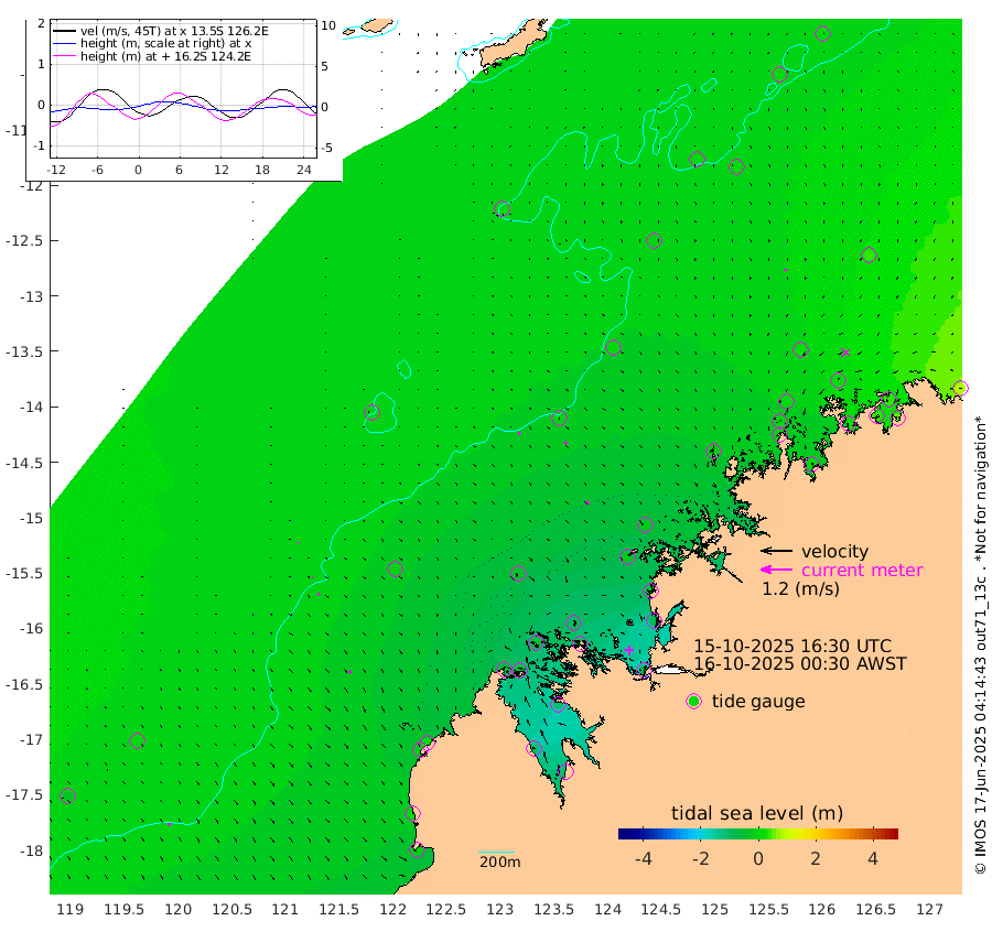 9cm/s 126T +10cm/s rms + 1cm/s 1T. NWSBRW 205m 8cm/s 148T +11cm/s rms + 6cm/s -110T. NWSROW 199m 14cm/s 144T +5cm/s rms + 2cm/s 65T. CAM050 58m 12cm/s 139T +12cm/s rms + 5cm/s 92T. CAM100 99m 1cm/s 169T +7cm/s rms + 1cm/s -85T. KIM400 396m 4cm/s 155T +9cm/s rms + 5cm/s -119T. KIM200 208m 8cm/s 155T +11cm/s rms + 5cm/s -147T. KIM100 99m 10cm/s 134T +8cm/s rms + 3cm/s -103T. KIM050 59m 8cm/s 163T +4cm/s rms + 2cm/s 23T. TIMORS88 91m -15cm Imperieuse Reef 3cm Mermaid Reef -15cm Broome -1cm Cape Baskerville 16cm Red Bluff 4cm Cape Boileau -3cm Scott Reef (WA) 3cm Ashmore Reef -50cm Karrakatta Bay -52cm Sunday Island -113cm Valentine Island -108cm Derby -114cm Port Usborne -52cm Bedford Islands -51cm Yampi Sound (Koolan Island) -102cm Macleay Island -34cm Adele Island -3cm Browse Island -82cm Shale Island -85cm Lizard Island -32cm Hall Point -28cm Degerando Island -19cm White Island -6cm Skua No. 4 Well 3cm Jabiru -8cm Maret Island 7cm Baudin Island 4cm Cape Voltaire (Krait Bay) 3cm Dillon Shoal 10cm Laminaria 9cm Port Warrender 13cm Troughton Island 10cm Cassini Island 16cm West Holothuria Reef Offshore 26cm Jar Island -8cm Lynher Bank 10cm Heywood Shoal 1cm Pee Shoal 32cm Van Cloon Shoal 44cm Carronade Island 41cm Guy Point 52cm Napier Broome Bay 75cm Lesueur Island
