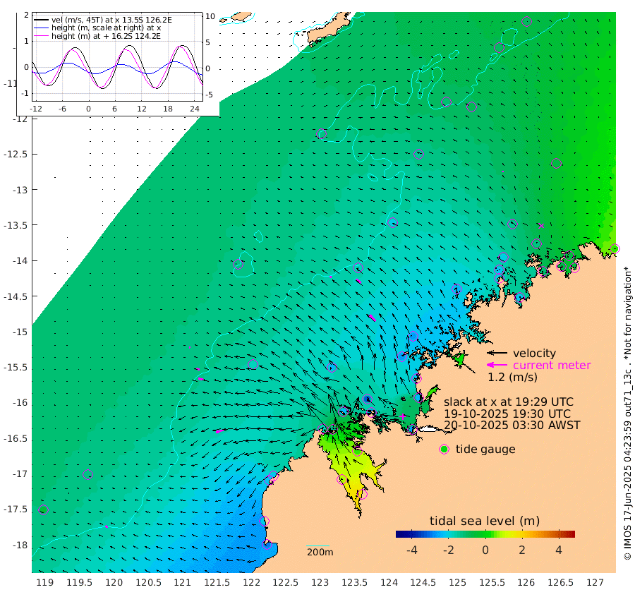 13cm/s -77T +10cm/s rms + 1cm/s 1T. NWSBRW 205m 15cm/s -67T +11cm/s rms + 6cm/s -110T. NWSROW 199m 52cm/s -46T +5cm/s rms + 2cm/s 65T. CAM050 58m 37cm/s -55T +12cm/s rms + 5cm/s 92T. CAM100 99m 10cm/s -91T +7cm/s rms + 1cm/s -85T. KIM400 396m 20cm/s -82T +9cm/s rms + 5cm/s -119T. KIM200 208m 32cm/s -77T +11cm/s rms + 5cm/s -147T. KIM100 99m 46cm/s -108T +8cm/s rms + 3cm/s -103T. KIM050 59m 5cm/s -5T +4cm/s rms + 2cm/s 23T. TIMORS88 91m -58cm Imperieuse Reef -133cm Mermaid Reef -290cm Broome -221cm Cape Baskerville -213cm Red Bluff -210cm Cape Boileau -126cm Scott Reef (WA) -125cm Ashmore Reef -167cm Karrakatta Bay -146cm Sunday Island 83cm Valentine Island 174cm Derby 39cm Port Usborne -229cm Bedford Islands -262cm Yampi Sound (Koolan Island) -327cm Macleay Island -234cm Adele Island -170cm Browse Island -268cm Shale Island -232cm Lizard Island -220cm Hall Point -255cm Degerando Island -256cm White Island -140cm Skua No. 4 Well -78cm Jabiru -235cm Maret Island -211cm Baudin Island -207cm Cape Voltaire (Krait Bay) -92cm Dillon Shoal -98cm Laminaria -216cm Port Warrender -128cm Troughton Island -198cm Cassini Island -149cm West Holothuria Reef Offshore -113cm Jar Island -167cm Lynher Bank -195cm Heywood Shoal -112cm Pee Shoal -63cm Van Cloon Shoal -74cm Carronade Island -85cm Guy Point -69cm Napier Broome Bay 30cm Lesueur Island