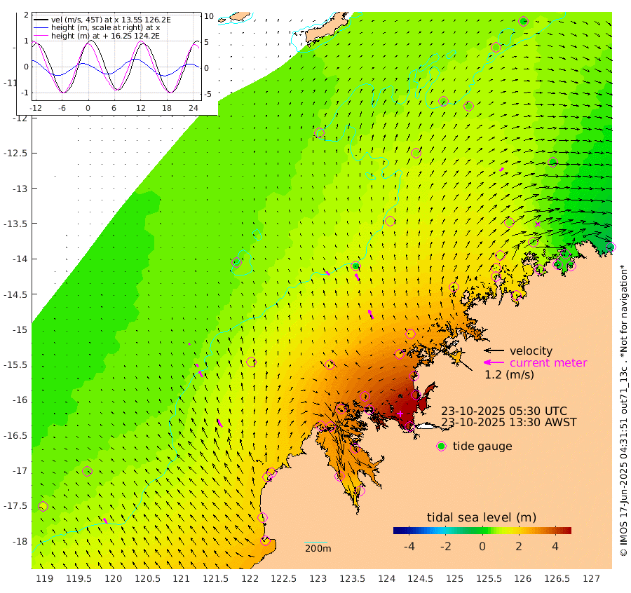 28cm/s -43T +10cm/s rms + 1cm/s 1T. NWSBRW 205m 37cm/s -32T +11cm/s rms + 6cm/s -110T. NWSROW 199m 59cm/s -28T +5cm/s rms + 2cm/s 65T. CAM050 58m 46cm/s -25T +12cm/s rms + 5cm/s 92T. CAM100 99m 9cm/s -27T +7cm/s rms + 1cm/s -85T. KIM400 396m 21cm/s -33T +9cm/s rms + 5cm/s -119T. KIM200 208m 40cm/s -30T +11cm/s rms + 5cm/s -147T. KIM100 99m 50cm/s -30T +8cm/s rms + 3cm/s -103T. KIM050 59m 28cm/s 52T +4cm/s rms + 2cm/s 23T. TIMORS88 91m 121cm Imperieuse Reef 49cm Mermaid Reef 185cm Broome 128cm Cape Baskerville 223cm Red Bluff 123cm Cape Boileau 40cm Scott Reef (WA) 71cm Ashmore Reef 298cm Karrakatta Bay 299cm Sunday Island 327cm Valentine Island 264cm Derby 305cm Port Usborne 300cm Bedford Islands 333cm Yampi Sound (Koolan Island) 328cm Macleay Island 187cm Adele Island -8cm Browse Island 434cm Shale Island 414cm Lizard Island 315cm Hall Point 249cm Degerando Island 212cm White Island 64cm Skua No. 4 Well 54cm Jabiru 143cm Maret Island 128cm Baudin Island 117cm Cape Voltaire (Krait Bay) 58cm Dillon Shoal 17cm Laminaria 155cm Port Warrender 57cm Troughton Island 98cm Cassini Island 63cm West Holothuria Reef Offshore 60cm Jar Island 107cm Lynher Bank 100cm Heywood Shoal 59cm Pee Shoal 23cm Van Cloon Shoal -8cm Carronade Island -8cm Guy Point -14cm Napier Broome Bay -98cm Lesueur Island
