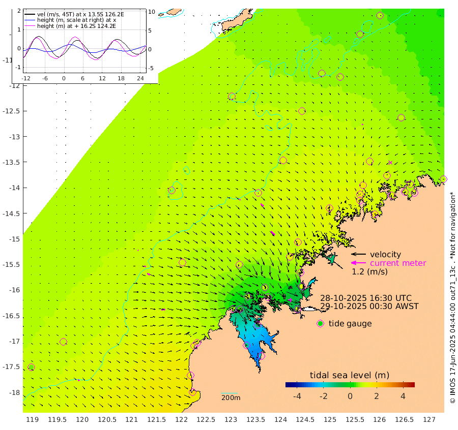 11cm/s 97T +10cm/s rms + 1cm/s 1T. NWSBRW 205m 16cm/s 124T +11cm/s rms + 6cm/s -110T. NWSROW 199m 44cm/s 137T +5cm/s rms + 2cm/s 65T. CAM050 58m 31cm/s 128T +12cm/s rms + 5cm/s 92T. CAM100 99m 6cm/s 101T +7cm/s rms + 1cm/s -85T. KIM400 396m 14cm/s 108T +9cm/s rms + 5cm/s -119T. KIM200 208m 26cm/s 112T +11cm/s rms + 5cm/s -147T. KIM100 99m 32cm/s 86T +8cm/s rms + 3cm/s -103T. KIM050 59m 8cm/s -158T +4cm/s rms + 2cm/s 23T. TIMORS88 91m 46cm Imperieuse Reef 97cm Mermaid Reef 185cm Broome 145cm Cape Baskerville 135cm Red Bluff 151cm Cape Boileau 89cm Scott Reef (WA) 94cm Ashmore Reef 68cm Karrakatta Bay 39cm Sunday Island -143cm Valentine Island -208cm Derby -116cm Port Usborne 109cm Bedford Islands 132cm Yampi Sound (Koolan Island) 106cm Macleay Island 114cm Adele Island 120cm Browse Island 115cm Shale Island 143cm Lizard Island 99cm Hall Point 152cm Degerando Island 154cm White Island 103cm Skua No. 4 Well 86cm Jabiru 160cm Maret Island 149cm Baudin Island 162cm Cape Voltaire (Krait Bay) 63cm Dillon Shoal 78cm Laminaria 166cm Port Warrender 127cm Troughton Island 154cm Cassini Island 120cm West Holothuria Reef Offshore 126cm Jar Island 115cm Lynher Bank 146cm Heywood Shoal 90cm Pee Shoal 93cm Van Cloon Shoal 120cm Carronade Island 121cm Guy Point 130cm Napier Broome Bay 101cm Lesueur Island