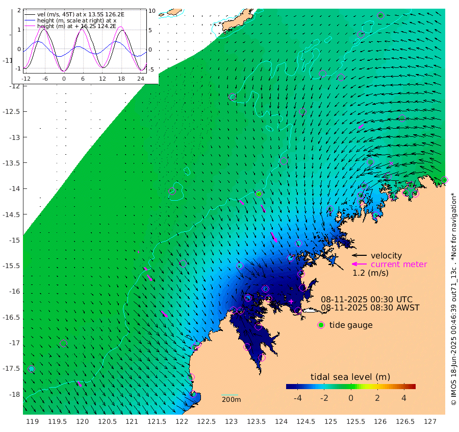 47cm/s 135T +10cm/s rms + 1cm/s 1T. NWSBRW 205m 50cm/s 147T +11cm/s rms + 6cm/s -110T. NWSROW 199m 93cm/s 152T +5cm/s rms + 2cm/s 65T. CAM050 58m 70cm/s 154T +12cm/s rms + 5cm/s 92T. CAM100 99m 14cm/s 143T +7cm/s rms + 1cm/s -85T. KIM400 396m 31cm/s 137T +9cm/s rms + 5cm/s -119T. KIM200 208m 59cm/s 144T +11cm/s rms + 5cm/s -147T. KIM100 99m 68cm/s 134T +8cm/s rms + 3cm/s -103T. KIM050 59m 49cm/s -126T +4cm/s rms + 2cm/s 23T. TIMORS88 91m -181cm Imperieuse Reef -52cm Mermaid Reef -135cm Broome -96cm Cape Baskerville -176cm Red Bluff -100cm Cape Boileau -53cm Scott Reef (WA) -111cm Ashmore Reef -335cm Karrakatta Bay -347cm Sunday Island -491cm Valentine Island -489cm Derby -467cm Port Usborne -297cm Bedford Islands -328cm Yampi Sound (Koolan Island) -318cm Macleay Island -183cm Adele Island 39cm Browse Island -451cm Shale Island -437cm Lizard Island -315cm Hall Point -236cm Degerando Island -181cm White Island -104cm Skua No. 4 Well -134cm Jabiru -137cm Maret Island -122cm Baudin Island -127cm Cape Voltaire (Krait Bay) -128cm Dillon Shoal -61cm Laminaria -157cm Port Warrender -132cm Troughton Island -123cm Cassini Island -98cm West Holothuria Reef Offshore -117cm Jar Island -108cm Lynher Bank -109cm Heywood Shoal -120cm Pee Shoal -102cm Van Cloon Shoal -63cm Carronade Island -63cm Guy Point -66cm Napier Broome Bay -36cm Lesueur Island