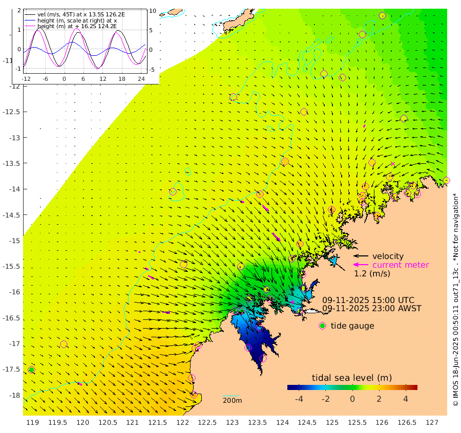29cm/s 115T +10cm/s rms + 1cm/s 1T. NWSBRW 205m 37cm/s 131T +11cm/s rms + 6cm/s -110T. NWSROW 199m 94cm/s 139T +5cm/s rms + 2cm/s 65T. CAM050 58m 68cm/s 134T +12cm/s rms + 5cm/s 92T. CAM100 99m 14cm/s 110T +7cm/s rms + 1cm/s -85T. KIM400 396m 31cm/s 116T +9cm/s rms + 5cm/s -119T. KIM200 208m 56cm/s 120T +11cm/s rms + 5cm/s -147T. KIM100 99m 66cm/s 97T +8cm/s rms + 3cm/s -103T. KIM050 59m 23cm/s -147T +4cm/s rms + 2cm/s 23T. TIMORS88 91m 21cm Imperieuse Reef 148cm Mermaid Reef 257cm Broome 205cm Cape Baskerville 165cm Red Bluff 210cm Cape Boileau 137cm Scott Reef (WA) 127cm Ashmore Reef 28cm Karrakatta Bay 5cm Sunday Island -320cm Valentine Island -400cm Derby -264cm Port Usborne 97cm Bedford Islands 137cm Yampi Sound (Koolan Island) 139cm Macleay Island 159cm Adele Island 204cm Browse Island 76cm Shale Island 97cm Lizard Island 141cm Hall Point 181cm Degerando Island 214cm White Island 138cm Skua No. 4 Well 105cm Jabiru 219cm Maret Island 208cm Baudin Island 219cm Cape Voltaire (Krait Bay) 89cm Dillon Shoal 123cm Laminaria 225cm Port Warrender 164cm Troughton Island 208cm Cassini Island 177cm West Holothuria Reef Offshore 163cm Jar Island 161cm Lynher Bank 208cm Heywood Shoal 116cm Pee Shoal 119cm Van Cloon Shoal 170cm Carronade Island 179cm Guy Point 179cm Napier Broome Bay 131cm Lesueur Island