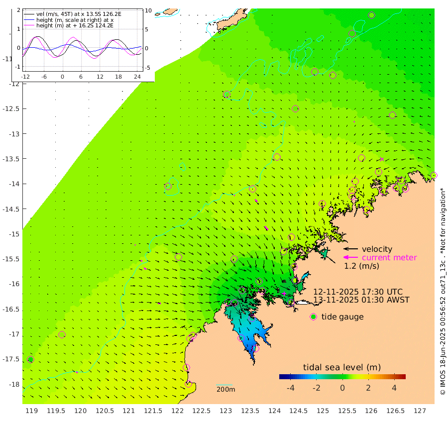 7cm/s 102T +10cm/s rms + 1cm/s 1T. NWSBRW 205m 15cm/s 129T +11cm/s rms + 6cm/s -110T. NWSROW 199m 39cm/s 141T +5cm/s rms + 2cm/s 65T. CAM050 58m 28cm/s 134T +12cm/s rms + 5cm/s 92T. CAM100 99m 6cm/s 108T +7cm/s rms + 1cm/s -85T. KIM400 396m 13cm/s 118T +9cm/s rms + 5cm/s -119T. KIM200 208m 23cm/s 123T +11cm/s rms + 5cm/s -147T. KIM100 99m 27cm/s 95T +8cm/s rms + 3cm/s -103T. KIM050 59m 8cm/s -135T +4cm/s rms + 2cm/s 23T. TIMORS88 91m 15cm Imperieuse Reef 71cm Mermaid Reef 133cm Broome 102cm Cape Baskerville 103cm Red Bluff 113cm Cape Boileau 60cm Scott Reef (WA) 60cm Ashmore Reef 29cm Karrakatta Bay 14cm Sunday Island -167cm Valentine Island -207cm Derby -138cm Port Usborne 44cm Bedford Islands 83cm Yampi Sound (Koolan Island) 52cm Macleay Island 71cm Adele Island 92cm Browse Island 63cm Shale Island 85cm Lizard Island 179cm Hall Point 99cm Degerando Island 123cm White Island 57cm Skua No. 4 Well 71cm Jabiru 107cm Maret Island 115cm Baudin Island 113cm Cape Voltaire (Krait Bay) 41cm Dillon Shoal 51cm Laminaria 124cm Port Warrender 81cm Troughton Island 100cm Cassini Island 91cm West Holothuria Reef Offshore 98cm Jar Island 81cm Lynher Bank 103cm Heywood Shoal 46cm Pee Shoal 69cm Van Cloon Shoal 100cm Carronade Island 102cm Guy Point 112cm Napier Broome Bay 89cm Lesueur Island