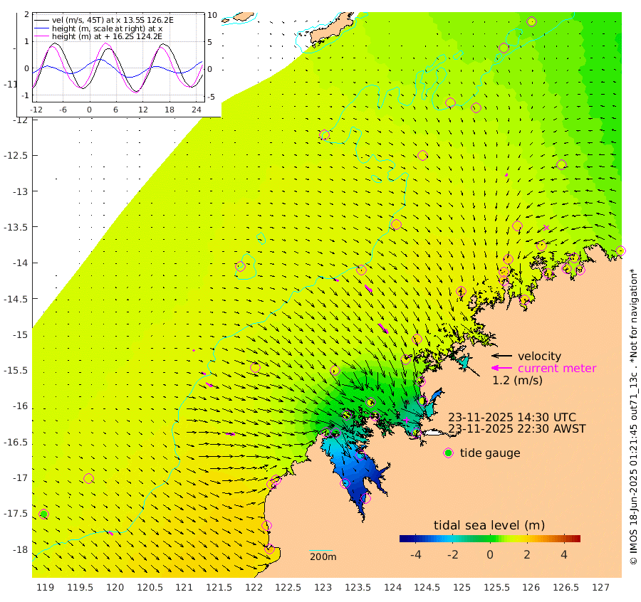 23cm/s 113T +10cm/s rms + 1cm/s 1T. NWSBRW 205m 29cm/s 130T +11cm/s rms + 6cm/s -110T. NWSROW 199m 77cm/s 138T +5cm/s rms + 2cm/s 65T. CAM050 58m 56cm/s 132T +12cm/s rms + 5cm/s 92T. CAM100 99m 11cm/s 108T +7cm/s rms + 1cm/s -85T. KIM400 396m 25cm/s 114T +9cm/s rms + 5cm/s -119T. KIM200 208m 44cm/s 118T +11cm/s rms + 5cm/s -147T. KIM100 99m 54cm/s 95T +8cm/s rms + 3cm/s -103T. KIM050 59m 19cm/s -145T +4cm/s rms + 2cm/s 23T. TIMORS88 91m 34cm Imperieuse Reef 129cm Mermaid Reef 228cm Broome 186cm Cape Baskerville 155cm Red Bluff 184cm Cape Boileau 120cm Scott Reef (WA) 124cm Ashmore Reef 57cm Karrakatta Bay 13cm Sunday Island -228cm Valentine Island -312cm Derby -195cm Port Usborne 101cm Bedford Islands 130cm Yampi Sound (Koolan Island) 141cm Macleay Island 148cm Adele Island 179cm Browse Island 91cm Shale Island 100cm Lizard Island 120cm Hall Point 163cm Degerando Island 182cm White Island 137cm Skua No. 4 Well 103cm Jabiru 203cm Maret Island 195cm Baudin Island 195cm Cape Voltaire (Krait Bay) 84cm Dillon Shoal 111cm Laminaria 192cm Port Warrender 162cm Troughton Island 199cm Cassini Island 160cm West Holothuria Reef Offshore 152cm Jar Island 137cm Lynher Bank 180cm Heywood Shoal 118cm Pee Shoal 113cm Van Cloon Shoal 147cm Carronade Island 151cm Guy Point 156cm Napier Broome Bay 120cm Lesueur Island