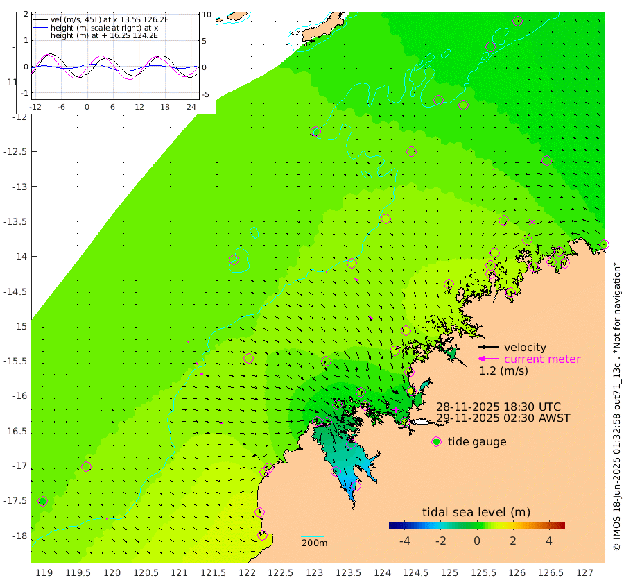 2cm/s 81T +10cm/s rms + 1cm/s 1T. NWSBRW 205m 11cm/s 124T +11cm/s rms + 6cm/s -110T. NWSROW 199m 30cm/s 143T +5cm/s rms + 2cm/s 65T. CAM050 58m 20cm/s 138T +12cm/s rms + 5cm/s 92T. CAM100 99m 5cm/s 105T +7cm/s rms + 1cm/s -85T. KIM400 396m 9cm/s 114T +9cm/s rms + 5cm/s -119T. KIM200 208m 17cm/s 122T +11cm/s rms + 5cm/s -147T. KIM100 99m 22cm/s 93T +8cm/s rms + 3cm/s -103T. KIM050 59m 5cm/s -91T +4cm/s rms + 2cm/s 23T. TIMORS88 91m 18cm Imperieuse Reef 55cm Mermaid Reef 113cm Broome 76cm Cape Baskerville 62cm Red Bluff 93cm Cape Boileau 52cm Scott Reef (WA) 45cm Ashmore Reef 23cm Karrakatta Bay 7cm Sunday Island -139cm Valentine Island -168cm Derby -97cm Port Usborne 45cm Bedford Islands 70cm Yampi Sound (Koolan Island) 49cm Macleay Island 55cm Adele Island 79cm Browse Island 65cm Shale Island 113cm Lizard Island 96cm Hall Point 87cm Degerando Island 92cm White Island 52cm Skua No. 4 Well 52cm Jabiru 87cm Maret Island 74cm Baudin Island 93cm Cape Voltaire (Krait Bay) 24cm Dillon Shoal 36cm Laminaria 89cm Port Warrender 58cm Troughton Island 77cm Cassini Island 59cm West Holothuria Reef Offshore 67cm Jar Island 69cm Lynher Bank 85cm Heywood Shoal 38cm Pee Shoal 44cm Van Cloon Shoal 66cm Carronade Island 67cm Guy Point 81cm Napier Broome Bay 46cm Lesueur Island