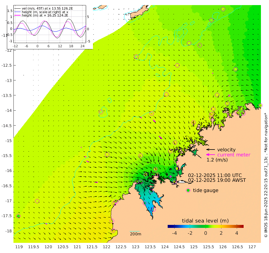 18cm/s 118T +10cm/s rms + 1cm/s 1T. NWSBRW 205m 22cm/s 126T +11cm/s rms + 6cm/s -110T. NWSROW 199m 58cm/s 136T +5cm/s rms + 2cm/s 65T. CAM050 58m 42cm/s 131T +12cm/s rms + 5cm/s 92T. CAM100 99m 10cm/s 103T +7cm/s rms + 1cm/s -85T. KIM400 396m 21cm/s 109T +9cm/s rms + 5cm/s -119T. KIM200 208m 35cm/s 113T +11cm/s rms + 5cm/s -147T. KIM100 99m 43cm/s 91T +8cm/s rms + 3cm/s -103T. KIM050 59m 12cm/s -131T +4cm/s rms + 2cm/s 23T. TIMORS88 91m 35cm Imperieuse Reef 113cm Mermaid Reef 189cm Broome 150cm Cape Baskerville 89cm Red Bluff 136cm Cape Boileau 108cm Scott Reef (WA) 105cm Ashmore Reef 55cm Karrakatta Bay 31cm Sunday Island -131cm Valentine Island -197cm Derby -96cm Port Usborne 107cm Bedford Islands 125cm Yampi Sound (Koolan Island) 164cm Macleay Island 138cm Adele Island 155cm Browse Island 106cm Shale Island 120cm Lizard Island 31cm Hall Point 140cm Degerando Island 158cm White Island 120cm Skua No. 4 Well 70cm Jabiru 168cm Maret Island 153cm Baudin Island 157cm Cape Voltaire (Krait Bay) 69cm Dillon Shoal 104cm Laminaria 150cm Port Warrender 133cm Troughton Island 156cm Cassini Island 126cm West Holothuria Reef Offshore 113cm Jar Island 127cm Lynher Bank 141cm Heywood Shoal 101cm Pee Shoal 78cm Van Cloon Shoal 104cm Carronade Island 110cm Guy Point 101cm Napier Broome Bay 78cm Lesueur Island