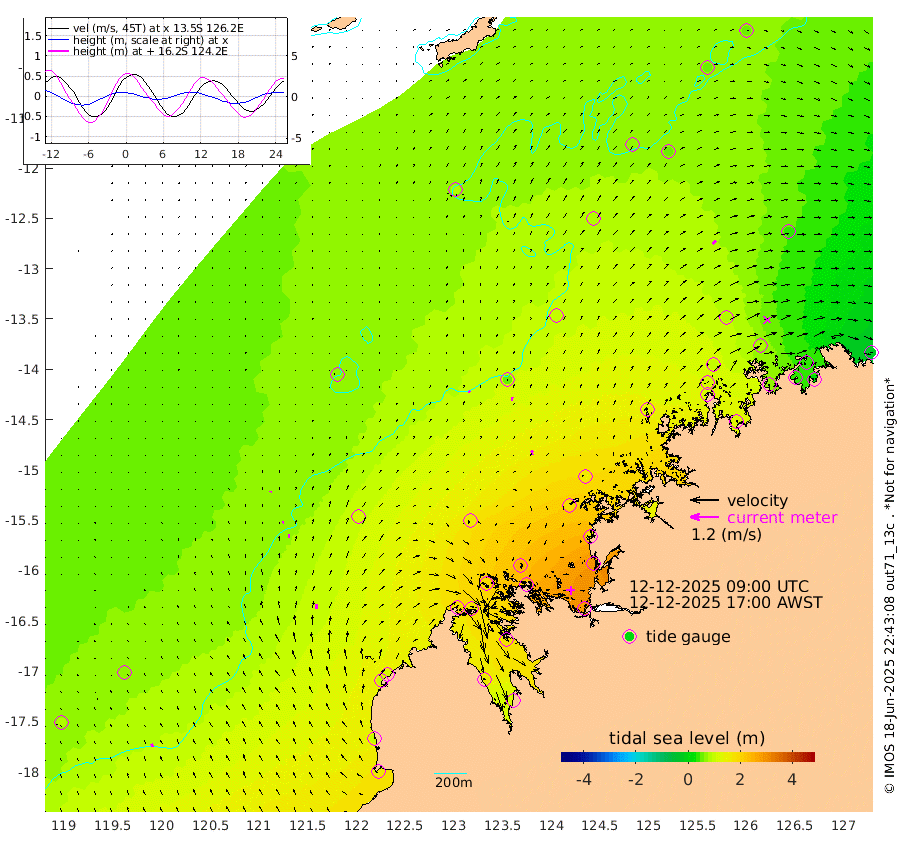 9cm/s -36T +10cm/s rms + 1cm/s 1T. NWSBRW 205m 15cm/s -19T +11cm/s rms + 6cm/s -110T. NWSROW 199m 17cm/s -6T +5cm/s rms + 2cm/s 65T. CAM050 58m 14cm/s 1T +12cm/s rms + 5cm/s 92T. CAM100 99m 4cm/s 26T +7cm/s rms + 1cm/s -85T. KIM400 396m 8cm/s 9T +9cm/s rms + 5cm/s -119T. KIM200 208m 15cm/s 3T +11cm/s rms + 5cm/s -147T. KIM100 99m 22cm/s 2T +8cm/s rms + 3cm/s -103T. KIM050 59m 18cm/s 47T +4cm/s rms + 2cm/s 23T. TIMORS88 91m 80cm Imperieuse Reef 67cm Mermaid Reef 152cm Broome 104cm Cape Baskerville 114cm Red Bluff 92cm Cape Boileau 63cm Scott Reef (WA) 76cm Ashmore Reef 169cm Karrakatta Bay 174cm Sunday Island 160cm Valentine Island 118cm Derby 172cm Port Usborne 194cm Bedford Islands 220cm Yampi Sound (Koolan Island) 245cm Macleay Island 150cm Adele Island 51cm Browse Island 275cm Shale Island 286cm Lizard Island 160cm Hall Point 176cm Degerando Island 165cm White Island 78cm Skua No. 4 Well 53cm Jabiru 127cm Maret Island 107cm Baudin Island 112cm Cape Voltaire (Krait Bay) 56cm Dillon Shoal 56cm Laminaria 125cm Port Warrender 79cm Troughton Island 99cm Cassini Island 76cm West Holothuria Reef Offshore 68cm Jar Island 106cm Lynher Bank 91cm Heywood Shoal 71cm Pee Shoal 37cm Van Cloon Shoal 31cm Carronade Island 32cm Guy Point 23cm Napier Broome Bay -21cm Lesueur Island