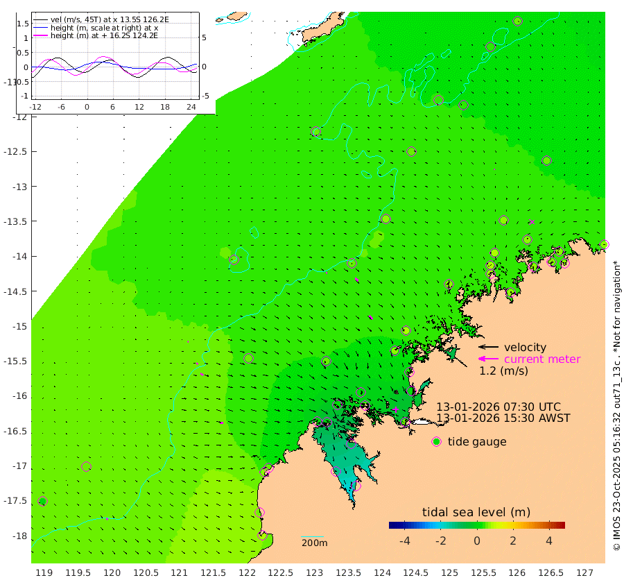 8cm/s 122T +10cm/s rms + 1cm/s 1T. NWSBRW 205m 11cm/s 129T +11cm/s rms + 6cm/s -110T. NWSROW 199m 29cm/s 136T +5cm/s rms + 2cm/s 65T. CAM050 58m 23cm/s 131T +12cm/s rms + 5cm/s 92T. CAM100 99m 5cm/s 103T +7cm/s rms + 1cm/s -85T. KIM400 396m 10cm/s 110T +9cm/s rms + 5cm/s -119T. KIM200 208m 19cm/s 120T +11cm/s rms + 5cm/s -147T. KIM100 99m 23cm/s 90T +8cm/s rms + 3cm/s -103T. KIM050 59m 3cm/s 116T +4cm/s rms + 2cm/s 23T. TIMORS88 91m 14cm Imperieuse Reef 57cm Mermaid Reef 88cm Broome 71cm Cape Baskerville 57cm Red Bluff 59cm Cape Boileau 45cm Scott Reef (WA) 52cm Ashmore Reef 19cm Karrakatta Bay 1cm Sunday Island -122cm Valentine Island -143cm Derby -90cm Port Usborne 29cm Bedford Islands 53cm Yampi Sound (Koolan Island) 27cm Macleay Island 47cm Adele Island 59cm Browse Island 49cm Shale Island 23cm Lizard Island 38cm Hall Point 62cm Degerando Island 77cm White Island 50cm Skua No. 4 Well 32cm Jabiru 72cm Maret Island 86cm Baudin Island 77cm Cape Voltaire (Krait Bay) 39cm Dillon Shoal 58cm Laminaria 72cm Port Warrender 66cm Troughton Island 77cm Cassini Island 67cm West Holothuria Reef Offshore 72cm Jar Island 55cm Lynher Bank 74cm Heywood Shoal 40cm Pee Shoal 47cm Van Cloon Shoal 67cm Carronade Island 70cm Guy Point 65cm Napier Broome Bay 72cm Lesueur Island