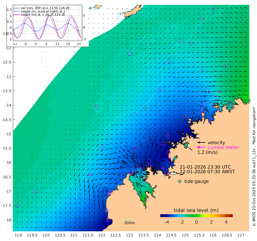 20cm/s 154T +10cm/s rms + 1cm/s 1T. NWSBRW 205m 17cm/s 175T +11cm/s rms + 6cm/s -110T. NWSROW 199m 15cm/s -113T +5cm/s rms + 2cm/s 65T. CAM050 58m 18cm/s -128T +12cm/s rms + 5cm/s 92T. CAM100 99m 7cm/s -142T +7cm/s rms + 1cm/s -85T. KIM400 396m 12cm/s -148T +9cm/s rms + 5cm/s -119T. KIM200 208m 23cm/s -156T +11cm/s rms + 5cm/s -147T. KIM100 99m 42cm/s -153T +8cm/s rms + 3cm/s -103T. KIM050 59m 27cm/s -128T +4cm/s rms + 2cm/s 23T. TIMORS88 91m -157cm Imperieuse Reef -153cm Mermaid Reef -365cm Broome -262cm Cape Baskerville -329cm Red Bluff -265cm Cape Boileau -141cm Scott Reef (WA) -181cm Ashmore Reef -342cm Karrakatta Bay -311cm Sunday Island -132cm Valentine Island -36cm Derby -174cm Port Usborne -367cm Bedford Islands -438cm Yampi Sound (Koolan Island) -458cm Macleay Island -316cm Adele Island -146cm Browse Island -521cm Shale Island -519cm Lizard Island -442cm Hall Point -386cm Degerando Island -354cm White Island -185cm Skua No. 4 Well -150cm Jabiru -307cm Maret Island -272cm Baudin Island -281cm Cape Voltaire (Krait Bay) -141cm Dillon Shoal -114cm Laminaria -302cm Port Warrender -196cm Troughton Island -269cm Cassini Island -198cm West Holothuria Reef Offshore -189cm Jar Island -218cm Lynher Bank -245cm Heywood Shoal -168cm Pee Shoal -126cm Van Cloon Shoal -121cm Carronade Island -117cm Guy Point -132cm Napier Broome Bay -4cm Lesueur Island