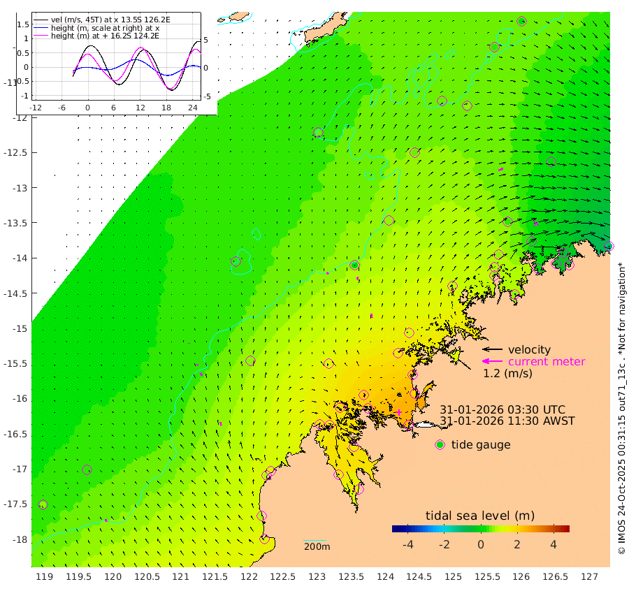 13cm/s -38T +10cm/s rms + 1cm/s 1T. NWSBRW 205m 18cm/s -29T +11cm/s rms + 6cm/s -110T. NWSROW 199m 22cm/s -12T +5cm/s rms + 2cm/s 65T. CAM050 58m 18cm/s -13T +12cm/s rms + 5cm/s 92T. CAM100 99m 4cm/s -9T +7cm/s rms + 1cm/s -85T. KIM400 396m 10cm/s -23T +9cm/s rms + 5cm/s -119T. KIM200 208m 19cm/s -20T +11cm/s rms + 5cm/s -147T. KIM100 99m 22cm/s -13T +8cm/s rms + 3cm/s -103T. KIM050 59m 31cm/s 70T +4cm/s rms + 2cm/s 23T. TIMORS88 91m 64cm Imperieuse Reef 35cm Mermaid Reef 120cm Broome 89cm Cape Baskerville 147cm Red Bluff 77cm Cape Boileau 34cm Scott Reef (WA) 53cm Ashmore Reef 178cm Karrakatta Bay 169cm Sunday Island 158cm Valentine Island 125cm Derby 159cm Port Usborne 188cm Bedford Islands 183cm Yampi Sound (Koolan Island) 215cm Macleay Island 130cm Adele Island 8cm Browse Island 238cm Shale Island 192cm Lizard Island 222cm Hall Point 150cm Degerando Island 107cm White Island 57cm Skua No. 4 Well 61cm Jabiru 95cm Maret Island 75cm Baudin Island 66cm Cape Voltaire (Krait Bay) 43cm Dillon Shoal 27cm Laminaria 66cm Port Warrender 24cm Troughton Island 72cm Cassini Island 35cm West Holothuria Reef Offshore 12cm Jar Island 62cm Lynher Bank 66cm Heywood Shoal 52cm Pee Shoal 4cm Van Cloon Shoal -33cm Carronade Island -36cm Guy Point -35cm Napier Broome Bay -105cm Lesueur Island