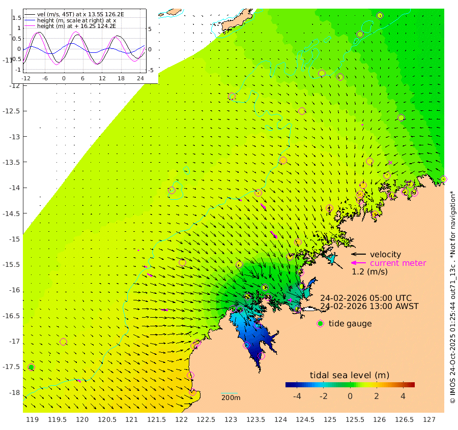 21cm/s 115T +10cm/s rms + 1cm/s 1T. NWSBRW 205m 29cm/s 130T +11cm/s rms + 6cm/s -110T. NWSROW 199m 78cm/s 139T +5cm/s rms + 2cm/s 65T. CAM050 58m 56cm/s 134T +12cm/s rms + 5cm/s 92T. CAM100 99m 11cm/s 108T +7cm/s rms + 1cm/s -85T. KIM400 396m 26cm/s 112T +9cm/s rms + 5cm/s -119T. KIM200 208m 47cm/s 118T +11cm/s rms + 5cm/s -147T. KIM100 99m 56cm/s 93T +8cm/s rms + 3cm/s -103T. KIM050 59m 11cm/s -158T +4cm/s rms + 2cm/s 23T. TIMORS88 91m 21cm Imperieuse Reef 127cm Mermaid Reef 237cm Broome 187cm Cape Baskerville 152cm Red Bluff 180cm Cape Boileau 114cm Scott Reef (WA) 103cm Ashmore Reef 35cm Karrakatta Bay 9cm Sunday Island -274cm Valentine Island -360cm Derby -224cm Port Usborne 111cm Bedford Islands 139cm Yampi Sound (Koolan Island) 124cm Macleay Island 139cm Adele Island 168cm Browse Island 101cm Shale Island 104cm Lizard Island 117cm Hall Point 177cm Degerando Island 194cm White Island 114cm Skua No. 4 Well 78cm Jabiru 191cm Maret Island 181cm Baudin Island 192cm Cape Voltaire (Krait Bay) 65cm Dillon Shoal 100cm Laminaria 199cm Port Warrender 133cm Troughton Island 178cm Cassini Island 142cm West Holothuria Reef Offshore 133cm Jar Island 143cm Lynher Bank 181cm Heywood Shoal 91cm Pee Shoal 85cm Van Cloon Shoal 129cm Carronade Island 138cm Guy Point 131cm Napier Broome Bay 90cm Lesueur Island