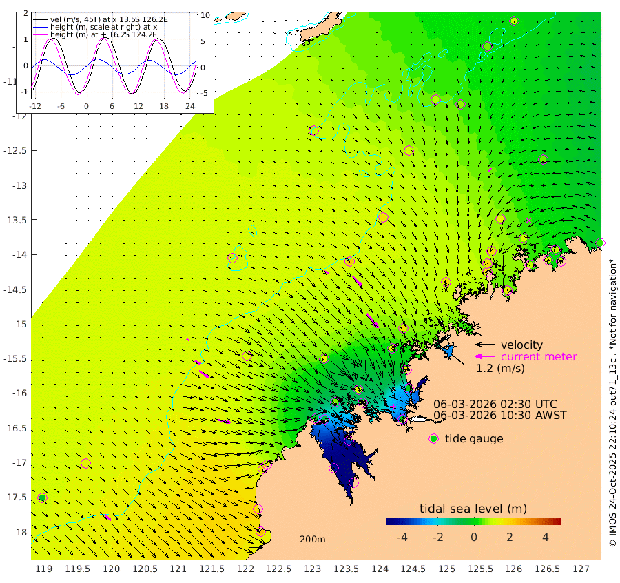 34cm/s 122T +10cm/s rms + 1cm/s 1T. NWSBRW 205m 47cm/s 135T +11cm/s rms + 6cm/s -110T. NWSROW 199m 114cm/s 141T +5cm/s rms + 2cm/s 65T. CAM050 58m 81cm/s 139T +12cm/s rms + 5cm/s 92T. CAM100 99m 17cm/s 114T +7cm/s rms + 1cm/s -85T. KIM400 396m 38cm/s 117T +9cm/s rms + 5cm/s -119T. KIM200 208m 69cm/s 123T +11cm/s rms + 5cm/s -147T. KIM100 99m 77cm/s 103T +8cm/s rms + 3cm/s -103T. KIM050 59m 23cm/s -147T +4cm/s rms + 2cm/s 23T. TIMORS88 91m -30cm Imperieuse Reef 129cm Mermaid Reef 239cm Broome 188cm Cape Baskerville 132cm Red Bluff 173cm Cape Boileau 117cm Scott Reef (WA) 95cm Ashmore Reef -26cm Karrakatta Bay -70cm Sunday Island -415cm Valentine Island -504cm Derby -347cm Port Usborne 47cm Bedford Islands 81cm Yampi Sound (Koolan Island) 125cm Macleay Island 139cm Adele Island 216cm Browse Island 15cm Shale Island -4cm Lizard Island 175cm Hall Point 139cm Degerando Island 176cm White Island 111cm Skua No. 4 Well 74cm Jabiru 190cm Maret Island 178cm Baudin Island 177cm Cape Voltaire (Krait Bay) 49cm Dillon Shoal 98cm Laminaria 164cm Port Warrender 106cm Troughton Island 174cm Cassini Island 136cm West Holothuria Reef Offshore 102cm Jar Island 127cm Lynher Bank 169cm Heywood Shoal 76cm Pee Shoal 54cm Van Cloon Shoal 101cm Carronade Island 108cm Guy Point 99cm Napier Broome Bay 34cm Lesueur Island