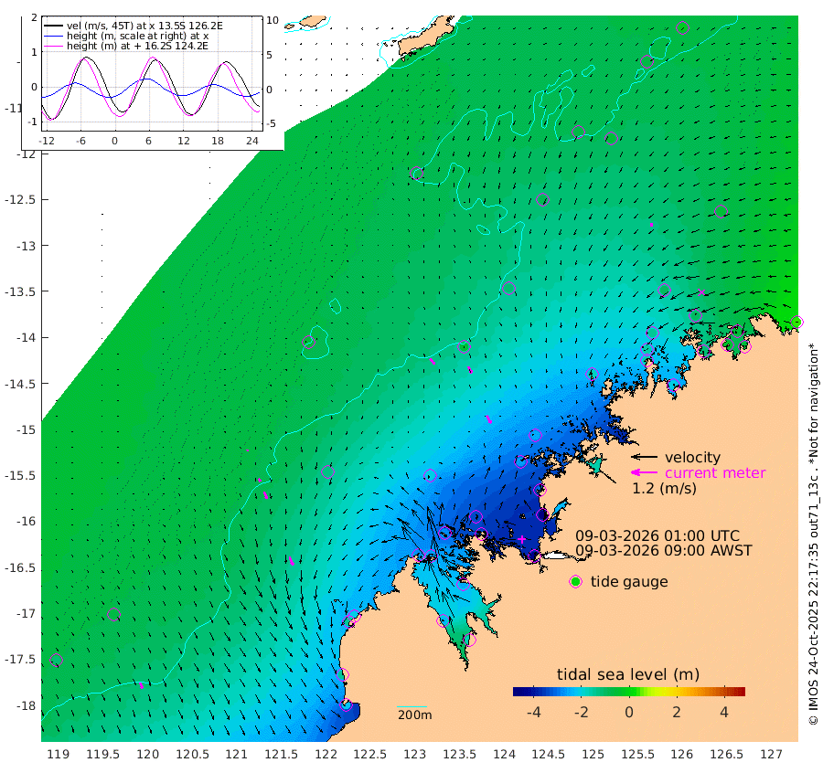 32cm/s 138T +10cm/s rms + 1cm/s 1T. NWSBRW 205m 29cm/s 154T +11cm/s rms + 6cm/s -110T. NWSROW 199m 40cm/s 151T +5cm/s rms + 2cm/s 65T. CAM050 58m 34cm/s 155T +12cm/s rms + 5cm/s 92T. CAM100 99m 7cm/s 164T +7cm/s rms + 1cm/s -85T. KIM400 396m 15cm/s 155T +9cm/s rms + 5cm/s -119T. KIM200 208m 33cm/s 158T +11cm/s rms + 5cm/s -147T. KIM100 99m 41cm/s 157T +8cm/s rms + 3cm/s -103T. KIM050 59m 17cm/s -171T +4cm/s rms + 2cm/s 23T. TIMORS88 91m -120cm Imperieuse Reef -66cm Mermaid Reef -222cm Broome -141cm Cape Baskerville -209cm Red Bluff -150cm Cape Boileau -56cm Scott Reef (WA) -85cm Ashmore Reef -272cm Karrakatta Bay -265cm Sunday Island -229cm Valentine Island -169cm Derby -241cm Port Usborne -274cm Bedford Islands -345cm Yampi Sound (Koolan Island) -338cm Macleay Island -200cm Adele Island -50cm Browse Island -435cm Shale Island -455cm Lizard Island -306cm Hall Point -270cm Degerando Island -252cm White Island -78cm Skua No. 4 Well -60cm Jabiru -175cm Maret Island -155cm Baudin Island -162cm Cape Voltaire (Krait Bay) -62cm Dillon Shoal -17cm Laminaria -200cm Port Warrender -98cm Troughton Island -136cm Cassini Island -97cm West Holothuria Reef Offshore -109cm Jar Island -128cm Lynher Bank -119cm Heywood Shoal -68cm Pee Shoal -52cm Van Cloon Shoal -49cm Carronade Island -43cm Guy Point -51cm Napier Broome Bay 35cm Lesueur Island