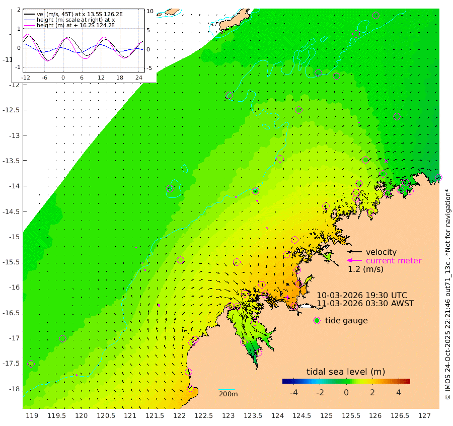 15cm/s -42T +10cm/s rms + 1cm/s 1T. NWSBRW 205m 16cm/s -23T +11cm/s rms + 6cm/s -110T. NWSROW 199m 19cm/s -39T +5cm/s rms + 2cm/s 65T. CAM050 58m 16cm/s -27T +12cm/s rms + 5cm/s 92T. CAM100 99m 4cm/s 1T +7cm/s rms + 1cm/s -85T. KIM400 396m 7cm/s -14T +9cm/s rms + 5cm/s -119T. KIM200 208m 15cm/s -21T +11cm/s rms + 5cm/s -147T. KIM100 99m 23cm/s -15T +8cm/s rms + 3cm/s -103T. KIM050 59m 7cm/s 33T +4cm/s rms + 2cm/s 23T. TIMORS88 91m 54cm Imperieuse Reef 33cm Mermaid Reef 140cm Broome 82cm Cape Baskerville 140cm Red Bluff 79cm Cape Boileau 22cm Scott Reef (WA) 36cm Ashmore Reef 162cm Karrakatta Bay 144cm Sunday Island 99cm Valentine Island 49cm Derby 111cm Port Usborne 158cm Bedford Islands 211cm Yampi Sound (Koolan Island) 198cm Macleay Island 111cm Adele Island 20cm Browse Island 275cm Shale Island 286cm Lizard Island 198cm Hall Point 155cm Degerando Island 153cm White Island 30cm Skua No. 4 Well 3cm Jabiru 95cm Maret Island 84cm Baudin Island 81cm Cape Voltaire (Krait Bay) 10cm Dillon Shoal -1cm Laminaria 93cm Port Warrender 17cm Troughton Island 59cm Cassini Island 33cm West Holothuria Reef Offshore 35cm Jar Island 67cm Lynher Bank 63cm Heywood Shoal 13cm Pee Shoal -9cm Van Cloon Shoal -15cm Carronade Island -19cm Guy Point -21cm Napier Broome Bay -93cm Lesueur Island