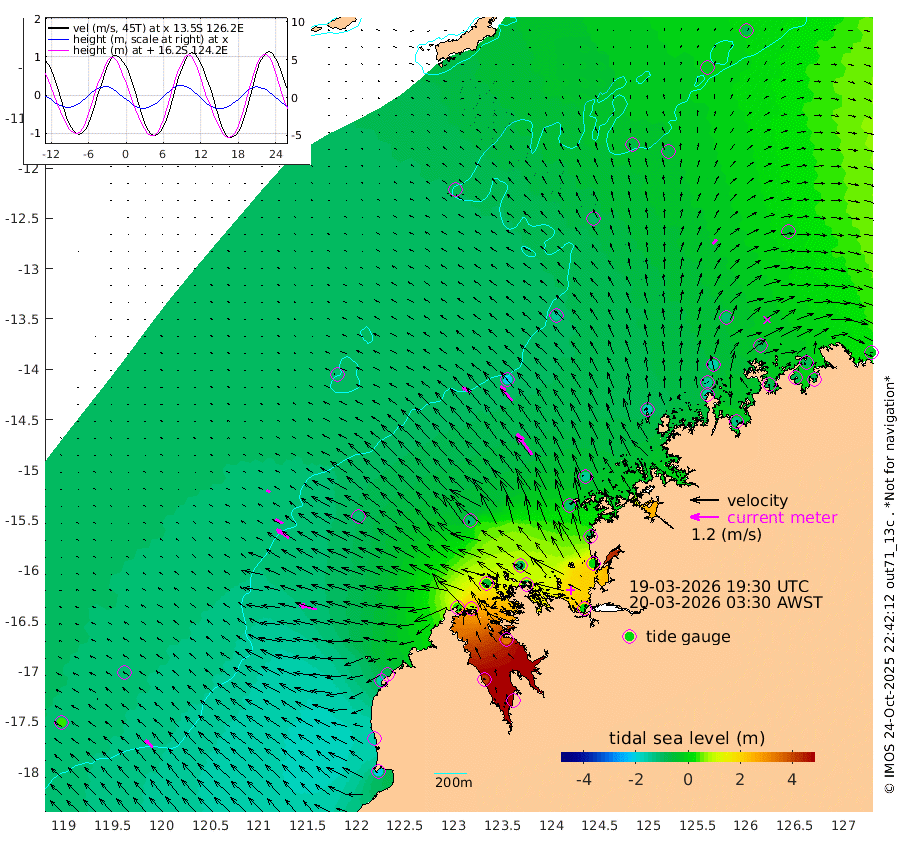 38cm/s -55T +10cm/s rms + 1cm/s 1T. NWSBRW 205m 43cm/s -48T +11cm/s rms + 6cm/s -110T. NWSROW 199m 109cm/s -36T +5cm/s rms + 2cm/s 65T. CAM050 58m 78cm/s -38T +12cm/s rms + 5cm/s 92T. CAM100 99m 17cm/s -65T +7cm/s rms + 1cm/s -85T. KIM400 396m 35cm/s -62T +9cm/s rms + 5cm/s -119T. KIM200 208m 63cm/s -55T +11cm/s rms + 5cm/s -147T. KIM100 99m 76cm/s -76T +8cm/s rms + 3cm/s -103T. KIM050 59m 25cm/s 44T +4cm/s rms + 2cm/s 23T. TIMORS88 91m 33cm Imperieuse Reef -114cm Mermaid Reef -209cm Broome -160cm Cape Baskerville -90cm Red Bluff -154cm Cape Boileau -109cm Scott Reef (WA) -81cm Ashmore Reef 43cm Karrakatta Bay 82cm Sunday Island 411cm Valentine Island 482cm Derby 331cm Port Usborne -34cm Bedford Islands -47cm Yampi Sound (Koolan Island) -100cm Macleay Island -116cm Adele Island -209cm Browse Island 21cm Shale Island 7cm Lizard Island -72cm Hall Point -112cm Degerando Island -136cm White Island -103cm Skua No. 4 Well -66cm Jabiru -166cm Maret Island -144cm Baudin Island -151cm Cape Voltaire (Krait Bay) -29cm Dillon Shoal -87cm Laminaria -123cm Port Warrender -86cm Troughton Island -150cm Cassini Island -110cm West Holothuria Reef Offshore -78cm Jar Island -114cm Lynher Bank -140cm Heywood Shoal -69cm Pee Shoal -44cm Van Cloon Shoal -80cm Carronade Island -82cm Guy Point -89cm Napier Broome Bay -25cm Lesueur Island