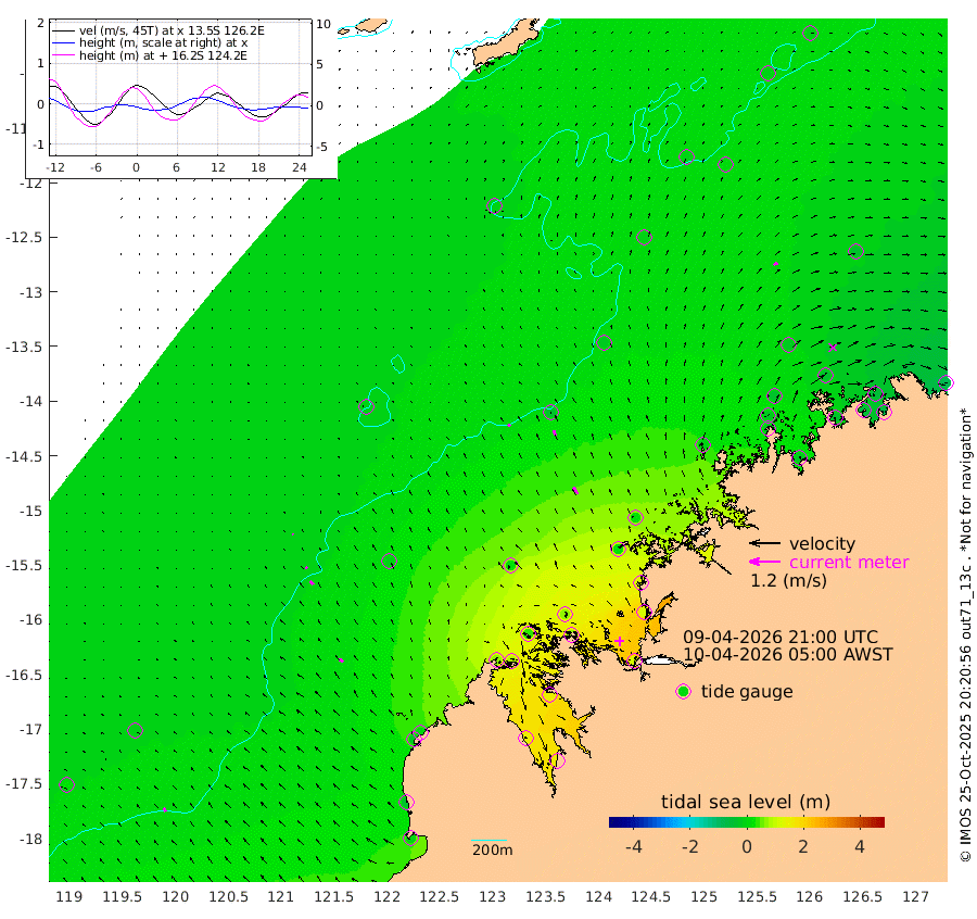 11cm/s -48T +10cm/s rms + 1cm/s 1T. NWSBRW 205m 15cm/s -38T +11cm/s rms + 6cm/s -110T. NWSROW 199m 31cm/s -32T +5cm/s rms + 2cm/s 65T. CAM050 58m 22cm/s -30T +12cm/s rms + 5cm/s 92T. CAM100 99m 3cm/s -32T +7cm/s rms + 1cm/s -85T. KIM400 396m 8cm/s -44T +9cm/s rms + 5cm/s -119T. KIM200 208m 17cm/s -44T +11cm/s rms + 5cm/s -147T. KIM100 99m 20cm/s -56T +8cm/s rms + 3cm/s -103T. KIM050 59m 16cm/s 60T +4cm/s rms + 2cm/s 23T. TIMORS88 91m 20cm Imperieuse Reef -13cm Mermaid Reef -7cm Broome -22cm Cape Baskerville 11cm Red Bluff -30cm Cape Boileau -15cm Scott Reef (WA) -6cm Ashmore Reef 69cm Karrakatta Bay 75cm Sunday Island 148cm Valentine Island 161cm Derby 146cm Port Usborne 41cm Bedford Islands 62cm Yampi Sound (Koolan Island) 74cm Macleay Island 20cm Adele Island -44cm Browse Island 112cm Shale Island 116cm Lizard Island 129cm Hall Point 16cm Degerando Island 17cm White Island -13cm Skua No. 4 Well 0cm Jabiru -13cm Maret Island -18cm Baudin Island -25cm Cape Voltaire (Krait Bay) -5cm Dillon Shoal -5cm Laminaria -29cm Port Warrender -37cm Troughton Island -32cm Cassini Island -26cm West Holothuria Reef Offshore -33cm Jar Island -4cm Lynher Bank -22cm Heywood Shoal -14cm Pee Shoal -36cm Van Cloon Shoal -56cm Carronade Island -58cm Guy Point -66cm Napier Broome Bay -89cm Lesueur Island