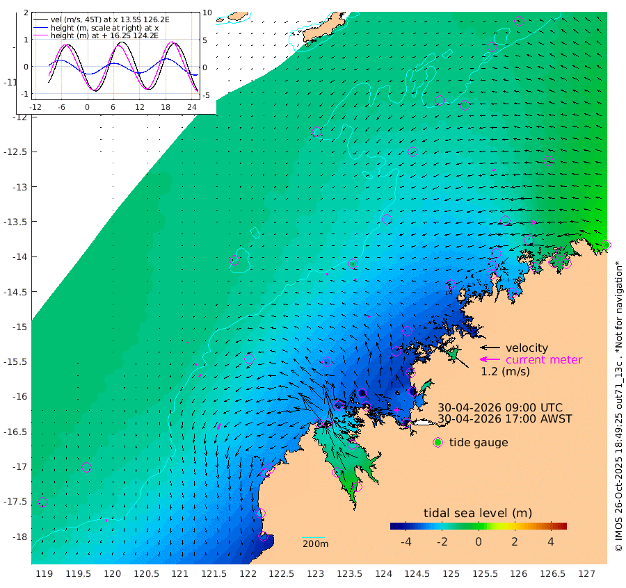 15cm/s 165T +10cm/s rms + 1cm/s 1T. NWSBRW 205m 15cm/s 176T +11cm/s rms + 6cm/s -110T. NWSROW 199m 14cm/s -124T +5cm/s rms + 2cm/s 65T. CAM050 58m 17cm/s -137T +12cm/s rms + 5cm/s 92T. CAM100 99m 7cm/s -144T +7cm/s rms + 1cm/s -85T. KIM400 396m 11cm/s -141T +9cm/s rms + 5cm/s -119T. KIM200 208m 21cm/s -150T +11cm/s rms + 5cm/s -147T. KIM100 99m 38cm/s -159T +8cm/s rms + 3cm/s -103T. KIM050 59m 18cm/s -111T +4cm/s rms + 2cm/s 23T. TIMORS88 91m -135cm Imperieuse Reef -136cm Mermaid Reef -321cm Broome -240cm Cape Baskerville -279cm Red Bluff -232cm Cape Boileau -128cm Scott Reef (WA) -155cm Ashmore Reef -305cm Karrakatta Bay -296cm Sunday Island -152cm Valentine Island -69cm Derby -179cm Port Usborne -354cm Bedford Islands -392cm Yampi Sound (Koolan Island) -429cm Macleay Island -288cm Adele Island -124cm Browse Island -451cm Shale Island -410cm Lizard Island -311cm Hall Point -342cm Degerando Island -312cm White Island -161cm Skua No. 4 Well -117cm Jabiru -270cm Maret Island -242cm Baudin Island -241cm Cape Voltaire (Krait Bay) -128cm Dillon Shoal -100cm Laminaria -268cm Port Warrender -167cm Troughton Island -229cm Cassini Island -170cm West Holothuria Reef Offshore -150cm Jar Island -197cm Lynher Bank -217cm Heywood Shoal -145cm Pee Shoal -96cm Van Cloon Shoal -89cm Carronade Island -96cm Guy Point -84cm Napier Broome Bay 16cm Lesueur Island