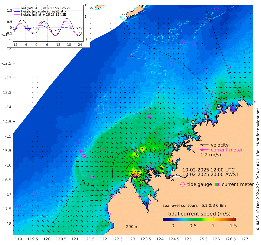 16cm/s 115T +10cm/s rms + 1cm/s 1T. NWSBRW 205m 20cm/s 130T +11cm/s rms + 6cm/s -110T. NWSROW 199m 49cm/s 137T +5cm/s rms + 2cm/s 65T. CAM050 58m 37cm/s 131T +12cm/s rms + 5cm/s 92T. CAM100 99m 9cm/s 107T +7cm/s rms + 1cm/s -85T. KIM400 396m 19cm/s 116T +9cm/s rms + 5cm/s -119T. KIM200 208m 31cm/s 119T +11cm/s rms + 5cm/s -147T. KIM100 99m 36cm/s 96T +8cm/s rms + 3cm/s -103T. KIM050 59m 13cm/s -122T +4cm/s rms + 2cm/s 23T. TIMORS88 91m 26cm Imperieuse Reef 98cm Mermaid Reef 141cm Broome 114cm Cape Baskerville 66cm Red Bluff 120cm Cape Boileau 96cm Scott Reef (WA) 89cm Ashmore Reef 33cm Karrakatta Bay 30cm Sunday Island -113cm Valentine Island -144cm Derby -83cm Port Usborne 59cm Bedford Islands 84cm Yampi Sound (Koolan Island) 126cm Macleay Island 110cm Adele Island 130cm Browse Island 55cm Shale Island 83cm Lizard Island 128cm Hall Point 99cm Degerando Island 127cm White Island 100cm Skua No. 4 Well 103cm Jabiru 132cm Maret Island 124cm Baudin Island 127cm Cape Voltaire (Krait Bay) 77cm Dillon Shoal 98cm Laminaria 128cm Port Warrender 114cm Troughton Island 122cm Cassini Island 116cm West Holothuria Reef Offshore 102cm Jar Island 105cm Lynher Bank 124cm Heywood Shoal 90cm Pee Shoal 85cm Van Cloon Shoal 110cm Carronade Island 121cm Guy Point 118cm Napier Broome Bay 94cm Lesueur Island