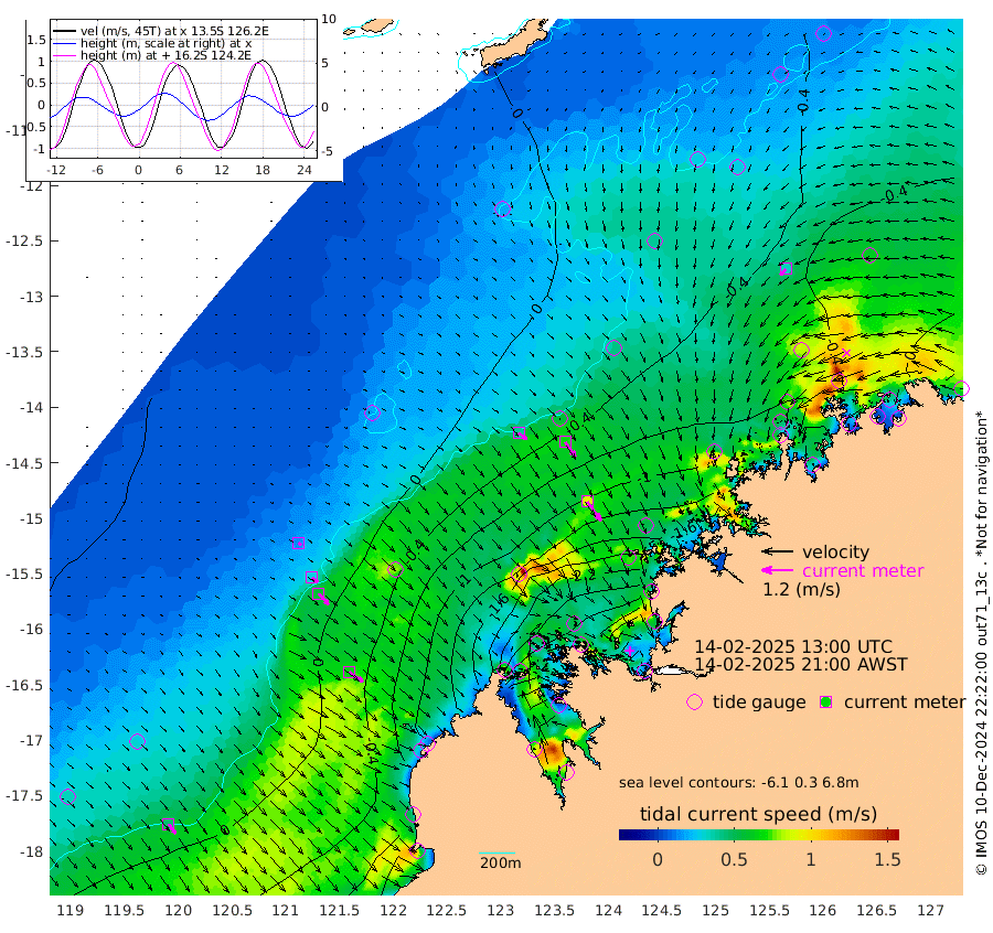39cm/s 128T +10cm/s rms + 1cm/s 1T. NWSBRW 205m 45cm/s 144T +11cm/s rms + 6cm/s -110T. NWSROW 199m 91cm/s 145T +5cm/s rms + 2cm/s 65T. CAM050 58m 69cm/s 144T +12cm/s rms + 5cm/s 92T. CAM100 99m 14cm/s 132T +7cm/s rms + 1cm/s -85T. KIM400 396m 29cm/s 132T +9cm/s rms + 5cm/s -119T. KIM200 208m 55cm/s 138T +11cm/s rms + 5cm/s -147T. KIM100 99m 65cm/s 125T +8cm/s rms + 3cm/s -103T. KIM050 59m 33cm/s -133T +4cm/s rms + 2cm/s 23T. TIMORS88 91m -102cm Imperieuse Reef 22cm Mermaid Reef -39cm Broome -11cm Cape Baskerville -75cm Red Bluff -10cm Cape Boileau 19cm Scott Reef (WA) -10cm Ashmore Reef -214cm Karrakatta Bay -239cm Sunday Island -390cm Valentine Island -402cm Derby -374cm Port Usborne -202cm Bedford Islands -211cm Yampi Sound (Koolan Island) -193cm Macleay Island -80cm Adele Island 87cm Browse Island -312cm Shale Island -284cm Lizard Island -82cm Hall Point -133cm Degerando Island -80cm White Island -2cm Skua No. 4 Well -1cm Jabiru -24cm Maret Island -12cm Baudin Island -21cm Cape Voltaire (Krait Bay) -26cm Dillon Shoal 36cm Laminaria -47cm Port Warrender -6cm Troughton Island -7cm Cassini Island 11cm West Holothuria Reef Offshore -5cm Jar Island -27cm Lynher Bank -2cm Heywood Shoal -10cm Pee Shoal 8cm Van Cloon Shoal 43cm Carronade Island 47cm Guy Point 53cm Napier Broome Bay 76cm Lesueur Island