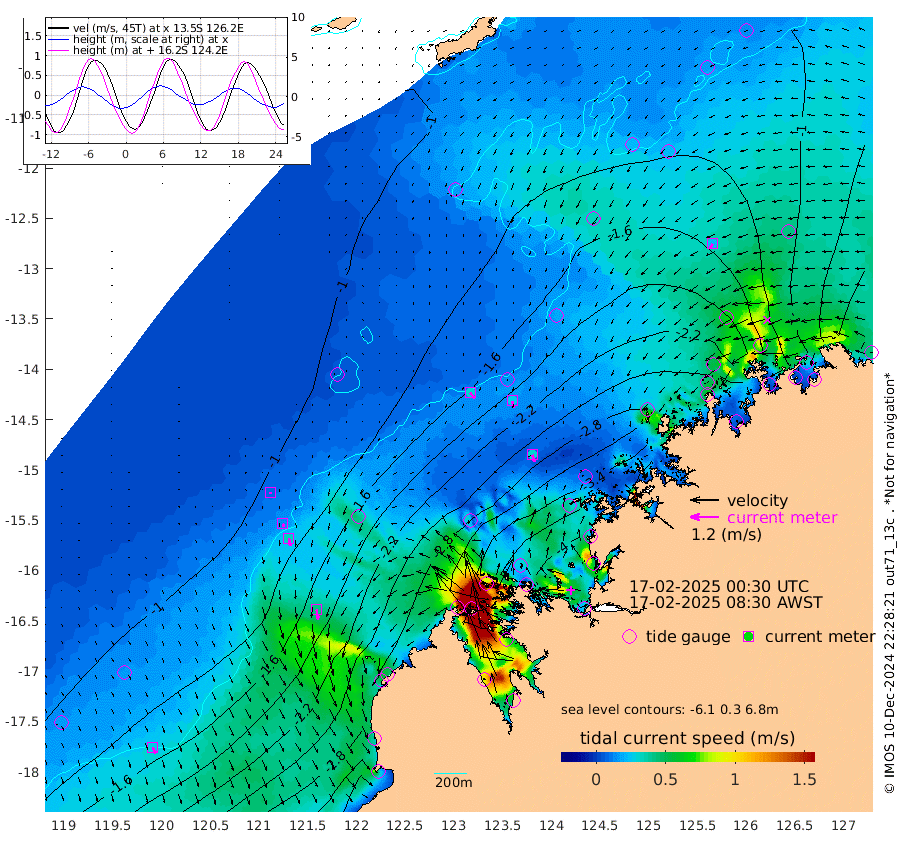 31cm/s 141T +10cm/s rms + 1cm/s 1T. NWSBRW 205m 29cm/s 158T +11cm/s rms + 6cm/s -110T. NWSROW 199m 31cm/s 163T +5cm/s rms + 2cm/s 65T. CAM050 58m 29cm/s 167T +12cm/s rms + 5cm/s 92T. CAM100 99m 7cm/s -180T +7cm/s rms + 1cm/s -85T. KIM400 396m 15cm/s 167T +9cm/s rms + 5cm/s -119T. KIM200 208m 32cm/s 168T +11cm/s rms + 5cm/s -147T. KIM100 99m 42cm/s 173T +8cm/s rms + 3cm/s -103T. KIM050 59m 22cm/s -149T +4cm/s rms + 2cm/s 23T. TIMORS88 91m -147cm Imperieuse Reef -105cm Mermaid Reef -296cm Broome -204cm Cape Baskerville -281cm Red Bluff -211cm Cape Boileau -95cm Scott Reef (WA) -130cm Ashmore Reef -325cm Karrakatta Bay -314cm Sunday Island -236cm Valentine Island -146cm Derby -245cm Port Usborne -342cm Bedford Islands -415cm Yampi Sound (Koolan Island) -415cm Macleay Island -265cm Adele Island -88cm Browse Island -507cm Shale Island -528cm Lizard Island -365cm Hall Point -342cm Degerando Island -317cm White Island -126cm Skua No. 4 Well -92cm Jabiru -242cm Maret Island -215cm Baudin Island -223cm Cape Voltaire (Krait Bay) -98cm Dillon Shoal -56cm Laminaria -268cm Port Warrender -149cm Troughton Island -200cm Cassini Island -148cm West Holothuria Reef Offshore -153cm Jar Island -178cm Lynher Bank -179cm Heywood Shoal -116cm Pee Shoal -91cm Van Cloon Shoal -86cm Carronade Island -81cm Guy Point -92cm Napier Broome Bay 15cm Lesueur Island