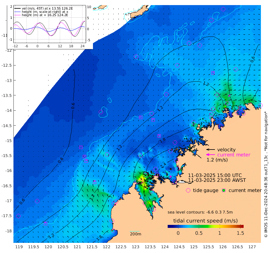 12cm/s -36T +10cm/s rms + 1cm/s 1T. NWSBRW 205m 17cm/s -21T +11cm/s rms + 6cm/s -110T. NWSROW 199m 14cm/s -13T +5cm/s rms + 2cm/s 65T. CAM050 58m 14cm/s -10T +12cm/s rms + 5cm/s 92T. CAM100 99m 5cm/s -12T +7cm/s rms + 1cm/s -85T. KIM400 396m 9cm/s -12T +9cm/s rms + 5cm/s -119T. KIM200 208m 18cm/s -10T +11cm/s rms + 5cm/s -147T. KIM100 99m 26cm/s 2T +8cm/s rms + 3cm/s -103T. KIM050 59m 14cm/s 27T +4cm/s rms + 2cm/s 23T. TIMORS88 91m 99cm Imperieuse Reef 68cm Mermaid Reef 186cm Broome 140cm Cape Baskerville 168cm Red Bluff 152cm Cape Boileau 72cm Scott Reef (WA) 92cm Ashmore Reef 210cm Karrakatta Bay 203cm Sunday Island 154cm Valentine Island 111cm Derby 164cm Port Usborne 228cm Bedford Islands 244cm Yampi Sound (Koolan Island) 284cm Macleay Island 181cm Adele Island 71cm Browse Island 291cm Shale Island 262cm Lizard Island 178cm Hall Point 219cm Degerando Island 179cm White Island 102cm Skua No. 4 Well 69cm Jabiru 163cm Maret Island 139cm Baudin Island 149cm Cape Voltaire (Krait Bay) 90cm Dillon Shoal 39cm Laminaria 171cm Port Warrender 113cm Troughton Island 146cm Cassini Island 103cm West Holothuria Reef Offshore 96cm Jar Island 110cm Lynher Bank 128cm Heywood Shoal 97cm Pee Shoal 71cm Van Cloon Shoal 60cm Carronade Island 63cm Guy Point 68cm Napier Broome Bay -4cm Lesueur Island